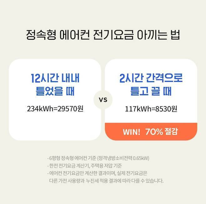 실제로 12시간 내내 정속형 에어컨을 켰을 때와, 2시간 ON - 2시간 OFF - 2시간 ON을 반복했을 때의 예상 전기요금을 계산해봤더니 후자가 70%나 전기요금 절약 효과가 있다는 사실!