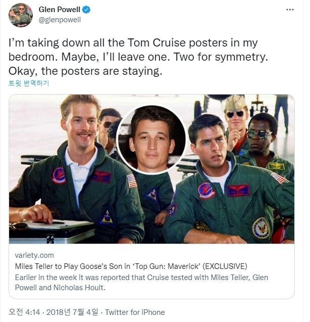 탑건 : 매버릭 오디션 떨어진후 톰크루즈 포스터 떼겠다고 트윗했던 배우