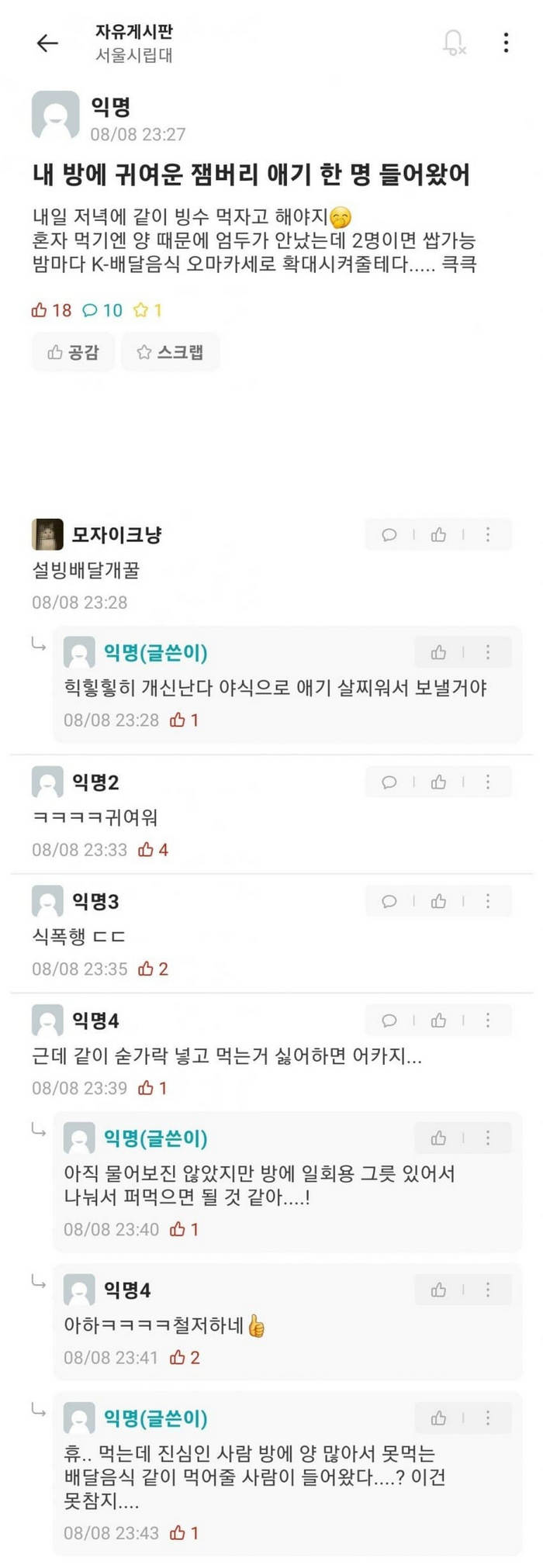 잼버리 애기 살찌워서 보낼거라는 서울시립대생 작성자이장◁◁|작성시간23.08.09|조회수608 목록 댓글 0 글자크기 작게가 글자크기 크게가 다음검색 현재 게시글 추가 기능 열기 북마크 공유하기 신고 센터로 신고 댓글 댓글 0 댓글쓰기 답글쓰기 댓글 리스트