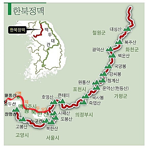 그 중에서도 백두대간과 한북정맥은 남북 분단으로 완전 종주가 불가능 합니다.