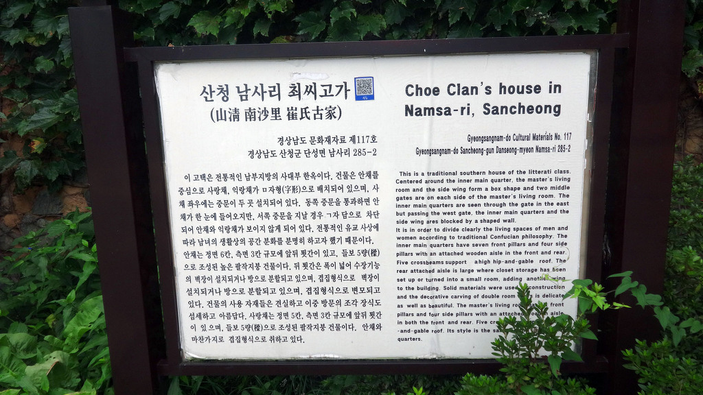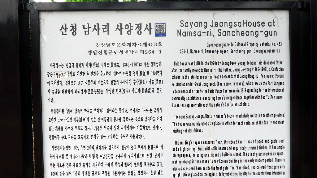 ▲ 사수의 북쪽에 있는 정사라는 뜻의 ‘사양정사’ 남사예담촌에서 가장 큰 집이며 정사는 몸과 마음을 닦는 곳이라는 의미이고, 여기에 사양(泗陽)이라는 이름이 앞에 붙어 ‘사양정사’는 사수의 남쪽의 학문을 연마하는 정사(몸과 마음을 닦는 집)라는 뜻입니다.