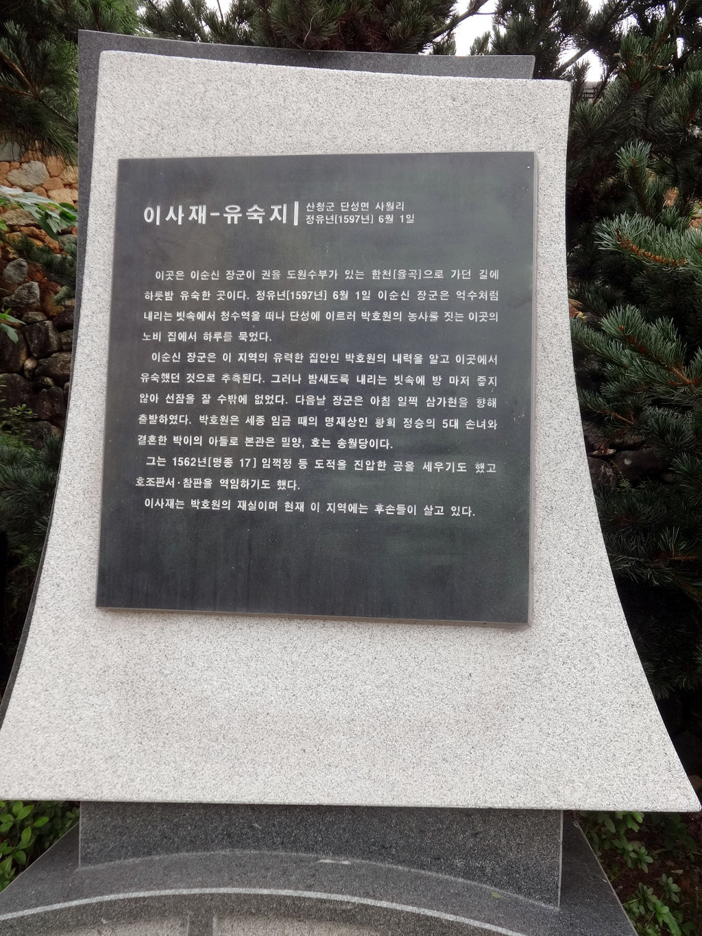 충무공 이순신 장군이 백의종군길에 하룻밤 묵었던 곳 임진왜란 당시 남해의 제해권을 장악한 이순신 장군이 모함으로 인해 한양으로 압송되어 죽을 위기에 놓였다. 이때 영의정 류성용과 판중추부사 정탁 등의 진언으로 사형의 위기를 넘기어 1597년 4월 1일 옥에서 나왔다. 그러나 왕의 명은 ‘백의종군’이었다. 삼도수군통제사에서 계급 없는 군인으로 강등된 이순신은 같은 해 4월 3일 한양을 출발하여 6월 2일 초계에 도착했다. 난중일기에 이때 ‘백의종군’하는 이순신 장군의 행로가 나와 있다. 이순신 장군은 1597년 6월 1일 하동군 옥종면 정수리에서 출발하여 오후 늦게 산청의 단성면 사월리 박효원 종의 집에서 유숙했다. 종의 집 헛간에서 빈대에 물려가며 잠을 설치면서도 구국의 일념으로 백의종군 길에 오른 이순신 장군은 날이 새자 길을 재촉하여 6월 2일 늦은 아침에 단계천(현재 산청 단계마을) 가에 도착하고 이곳에서 아침을 먹었다. 이후 삼가를 거쳐 권율 장군의 진영에 도착했다. 그곳에서 46일 간 머물다가 칠천량 해전의 참패 소식을 듣고 나서 권율 장군의 말에 따라 남해의 전세를 살피기 위해 7월 18일 삼가현을 거쳐 7월 19일에 단계천변을 지나 지금의 신안면 백마산성에 올라가서 지세를 살피고 단성현에서 하룻밤 유숙했다.