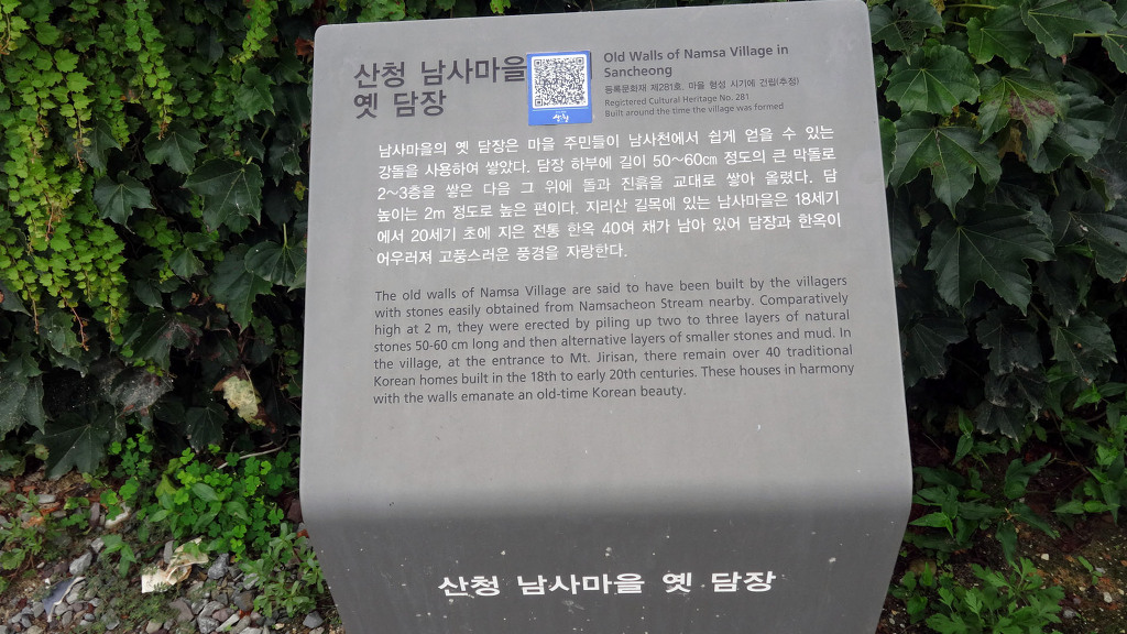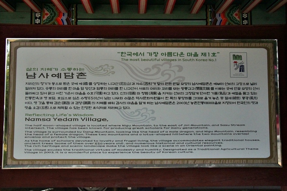 면우 곽종석 선생을 기리기 위해 유림과 제자들이 1920년에 설립한 서당으로 곽종석 선생은 조국의 독립운동과 파리장서를 통하여 우리나라 광복 운동의 기반을 구축하는 업적을 이룬 위인입니다. 서당은 강당, 서재, 사우로 되어있는데 지붕을 옆면으로 보았을 때 강당은 여덟 팔(八)자 모양이고, 서재는 사다리꼴이며, 사우는 사람 인(人)자 모양으로 서로 다른 모양을 하고 있음을 볼 수 있습니다. ◈ 기타 문중 서재 ○ 니사재(尼泗齋) 박씨 선조 송월당 박호원을 기리며 학문연마의 장소로 사용되었던 곳이라고 합니다. 현재, 문화재 제 328호로 지정되어 보호하고 있습니다. ○ 내현재(乃見齋) 이씨 선조 이숙순의 분암으로 이씨문중의 유생들이 공부하던 장소였는데 내현재를 앞서재라고 할 정도로 마을의 대표 학문 터였던 것을 알 수 있습니다. ○ 삼백헌 박씨문중의 서재였던 곳입니다 ○ 망추정(望楸亭) 밀양 박씨 문중의 재실로 송월당 박호원의 모친 황씨묘소 옆 분암이었다가 여러 번 중건되어 박씨문중의 유생들이 공부하는 곳으로 사용되어 지금에 이르고 있습니다. ○ 사효재(思孝齋) 1706년(숙종 32년), 아버지를 해치려는 화적의 칼을 자신의 몸으로 막아낸 영모당 이윤현의 효심을 기리기 위해 나라에서 효자비를 내렸으며 후손들이 사효재를 지었다. 사효재 마당의 향나무는 성주이씨 집안과 마을에서 제례를 올릴 때 향으로 사용하였으며 효심을 후손들에게 전하기 위해 이 향나무(수령 520년)를 심었다고 한다. ◈ 600년 감나무 하씨 고가인 분양고가 울안에는 세종 때 영의정을 지낸 하연이 7세 때 심었다는 마을의 길흉화복을 함께한 노거수인 600여년 된 감나무가 심어져 있습니다 700년 매화나무 분양고가에 심어져 있는 나무로 고려말의 문신 원정공 하즙이 심었다는 '원정매' 인데요. 몇 백 년씩 묵은 이 마을의 매화나무는 대부분 관직에서 물러나 낙향한 옛 선비들이 심은 것인데, 특히 그 중에서 '원정매'는 기품 있어 눈에 띄는 나무로 유명합니다. ◈ 300년 회화나무 마을 초입, 이상택 고가로 가는 입구에 있는 나무로 서로 x자로 몸을 포개고있는 것이 인상적인 나무입니다. 이 나무는 심는 집안에서 훌륭한 인재가 난다고 하는데요. 회화나무의 열매는 천연염색제로 쓰이기도 한답니다. ◈ 니구산 전설 유명한 중국 태산의 한 지맥인 니산은 공자의 출생지에 있는 산으로 공자의 어머니는 이 산에서 기도를 드려 공자를 낳았는데 공자의 머리 또한 니구산의 꼭대기처럼 가운데가 움푹 패여 있어 이름을 '구(丘)'라 하였다고 합니다. 남사예담촌의 니구산은 학문을 숭상하는 마음과 공자의 출생지와 비슷한 풍수적 모양을 한 것을 본 딴 것이라 할 수 있겠습니다. ◈ 북바위 고려말의 문신으로 조선조 초 진주지방으로 낙남(落南)한 우곡(隅谷) 정온(鄭溫)이 지었다고 하는 월아산기(月牙山記)에는 "니구산에 돌 떨어지니 오래된 밀양박씨는 모래위에 죽지 아니하고 푸른 잎이 돋아나며, 북바위에서 소리나니 늙은 성주이씨는 달 가운데서 스스로 피어나는 붉은 꽃이라" 라는 구절이 있는데 신기하게도 그대로 이루어졌다고 합니다. 즉, 니구산에서 돌이 떨어지면 밀양박씨 문중에서 벼슬이 나고 북바위에서 소리가 나면 성주이씨 문중에서 벼슬을 해왔다고 하는군요. 최근에 지리산으로 뻗는 관광도로를 만들어 마을 앞길이 확장되고 포장되는 공사에 당국에서 북바위를 제거키로 하였으나 마을 사람들 특히 성주이씨의 반대에 부딪혀서 북바위의 대좌(臺座)만 제거하여 도로를 내고 북바위 자체는 해를 입지 않았다는 뒷이야기가 전해지고 있습니다. ◈ 용소 청계가 북쪽으로 굽이쳐 흐르는 곳의 바위 밑에 물이 깊어 푸르게 보이는 곳인데 옛날에 용이 있었다는 전설이 있으며 무당이 굿을 한 적도 있었다고 합니다. 용소의 절벽 아래로는 큰 굴이 있다고도 알려져 있습니다.