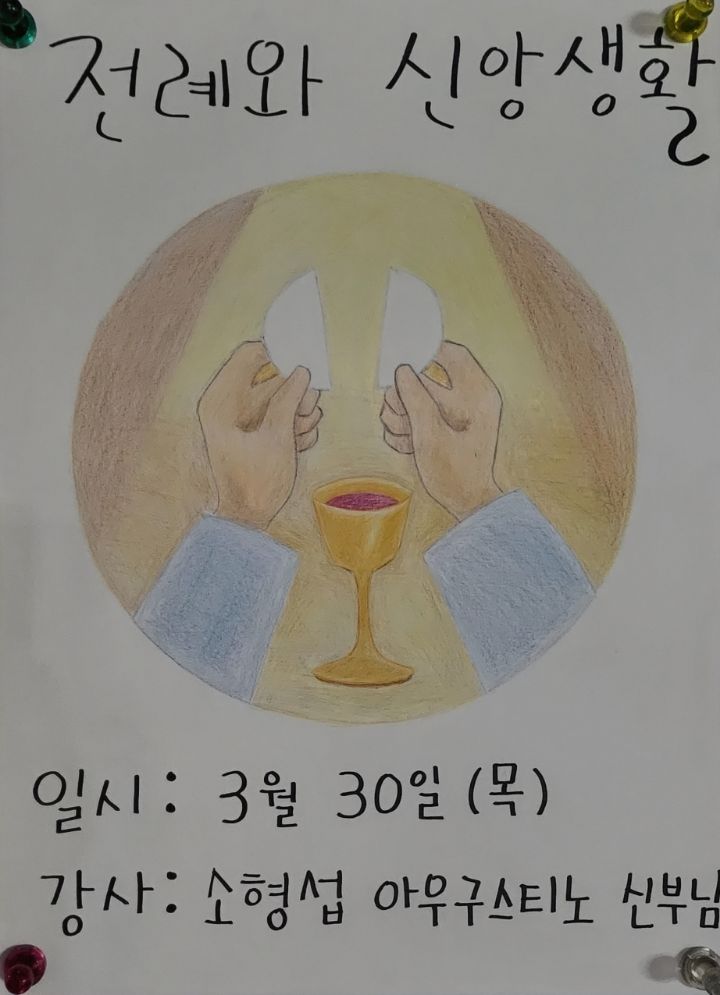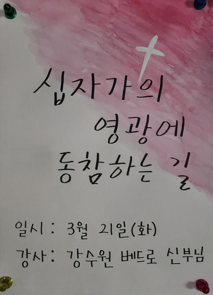 사순 특강 작성자박미숙(베로니카)|작성시간23.03.19|조회수119 목록 댓글 0 글자크기 작게가 글자크기 크게가 사순특강1.3월21일 (화) 저녁미사후 주제: 십자가의 영광에 동참하는 삶 강사: 강수원 베드로신부님2. 3월30일 (목) 저녁미사후 주제: 전례와 신앙생활 강사: 소형섭 아우구스티노신부님 다음검색 현재 게시글 추가 기능 열기 북마크 신고 센터로 신고 댓글 댓글 0 댓글쓰기 답글쓰기 댓글 리스트
