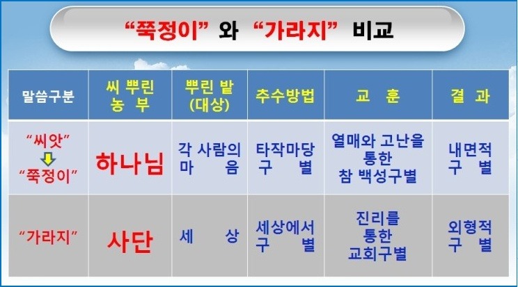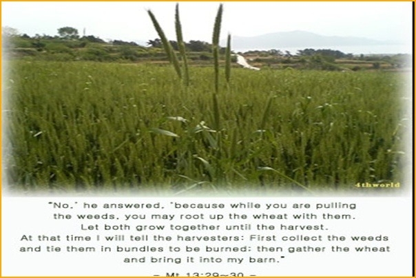 (마 13:18-42) “18 그런즉 씨 뿌리는 비유를 들으라 19 아무나 천국 말씀을 듣고 깨닫지 못할 때는 악한 자가 와서 그 마음에 뿌리운 것을 빼앗나니 이는 곧 길 가에 뿌리운 자요 20 돌밭에 뿌리웠다는 것은 말씀을 듣고 즉시 기쁨으로 받되 21 그 속에 뿌리가 없어 잠시 견디다가 말씀을 인하여 환난이나 핍박이 일어나는 때에는 곧 넘어지는 자요 22 가시떨기에 뿌리웠다는 것은 말씀을 들으나 세상의 염려와 재리의 유혹에 말씀이 막혀 결실치 못하는 자요 23 좋은 땅에 뿌리웠다는 것은 말씀을 듣고 깨닫는 자니 결실하여 혹 백배, 혹 육십배, 혹 삼십배가 되느니라 하시더라 24 예수께서 그들 앞에 또 비유를 베풀어 가라사대 천국은 좋은 씨를 제 밭에 뿌린 사람과 같으니 25 사람들이 잘 때에 그 원수가 와서 곡식 가운데 가라지를 덧뿌리고 갔더니 26 싹이 나고 결실할 때에 가라지도 보이거늘 27 집 주인의 종들이 와서 말하되 주여 밭에 좋은 씨를 심지 아니하였나이까 그러면 가라지가 어디서 생겼나이까 28 주인이 가로되 원수가 이렇게 하였구나 종들이 말하되 그러면 우리가 가서 이것을 뽑기를 원하시나이까 29 주인이 가로되 가만 두어라 가라지를 뽑다가 곡식까지 뽑을까 염려하노라 30 둘 다 추수 때까지 함께 자라게 두어라 추수 때에 내가 추숫군들에게 말하기를 가라지는 먼저 거두어 불사르게 단으로 묶고 곡식은 모아 내 곳간에 넣으라 하리라 ~ 37 대답하여 가라사대 좋은 씨를 뿌리는 이는 인자요 38 밭은 세상이요 좋은 씨는 천국의 아들들이요 가라지는 악한 자의 아들들이요 39 가라지를 심은 원수는 마귀요 추수때는 세상 끝이요 추숫군은 천사들이니 40 그런즉 가라지를 거두어 불에 사르는것 같이 세상끝에도 그러하리라 41 인자가 그 천사들을 보내리니 저희가 그 나라에서 모든 넘어지게 하는 것과 또 불법을 행하는 자들을 거두어 내어 42 풀무 불에 던져 넣으리니 거기서 울며 이를 갊이 있으리라”