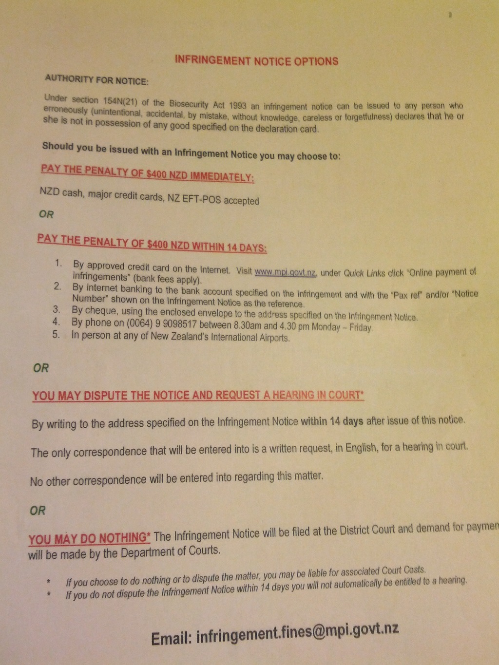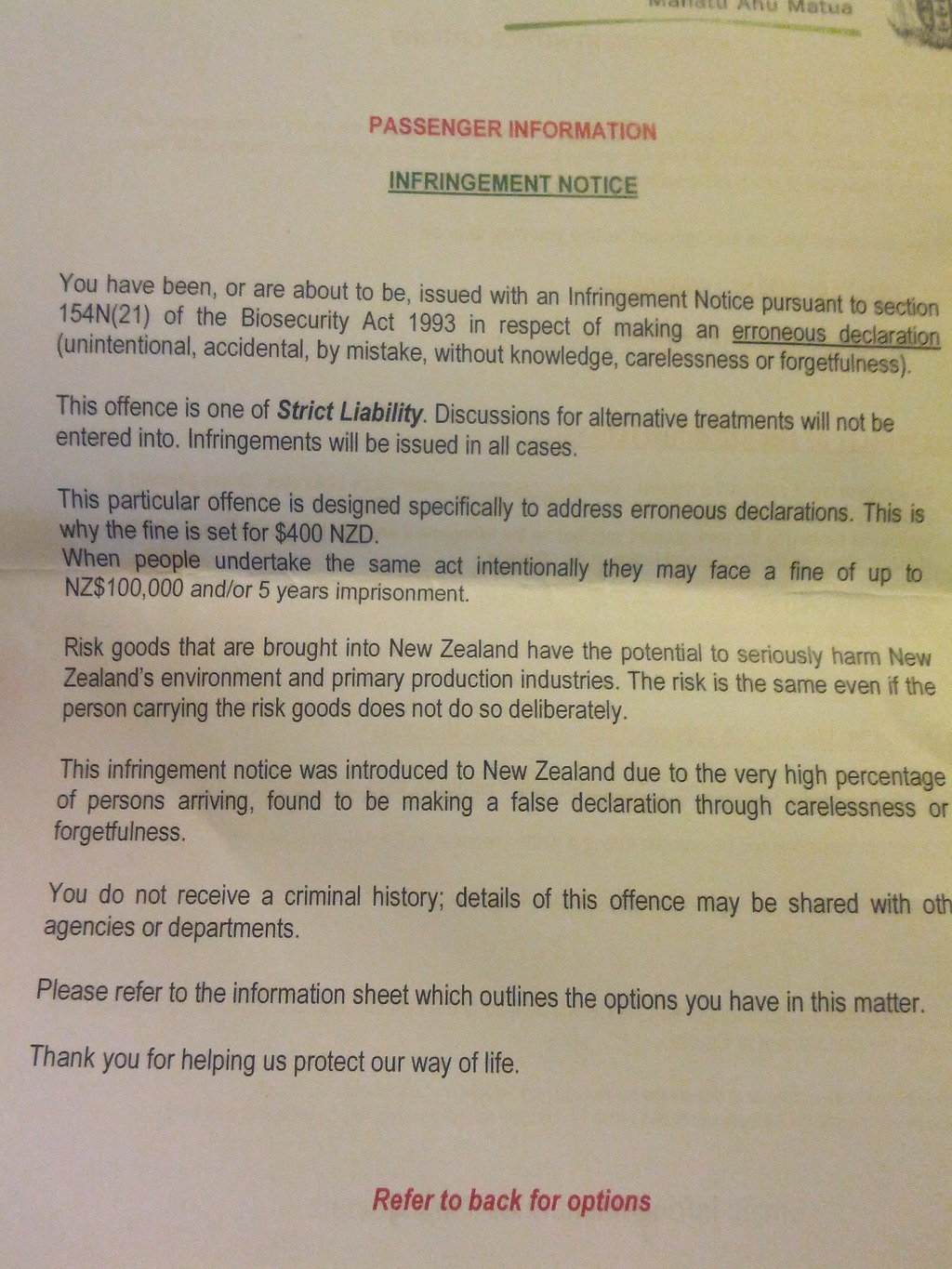골드코스트 경유해서 오클랜드로 가는길에 출발전 비행기에서 배고플까봐 먹으려고 푸드코트에서 스몰사이즈 샐러드두개를 샀습니다 비행기타고 오면서 샐러드 하나는 먹고 하나는 드레싱이 새서 통이 지저분해져서 시간도없고 들고 먹기도 애매하길래 세관신고전 버릴데있으면 버리려고 가지고 들어왔습니다. 비행기에서 준 세관신고하는 종이?에는 식품 체크란이있길래 캐리어랑 배낭만 해당되는줄알고 No에다 체크했습니다... 근데 버리려고 비닐봉투에 넣어온 샐러드도 체크하더라구요... 그래서 결국 벌금 400 물었습니다.
