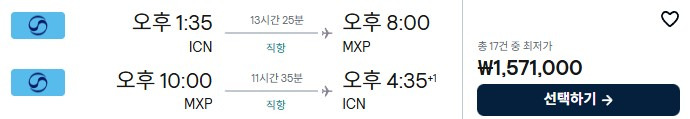 (출발) 밀라노 22:00 - (도착) 인천 16:45(+1일)