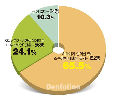 치과의사 전문의제도의 올바른 해결 방법으로는 당초 치과계 합의였던 ‘8% 소수정예 배출안 유지’가 65.5%로 압도적인 지지를 받았으며, 최근 제기된 ‘다수개방안’은 24.1%에 그쳤다. 치과전문의제에 ‘관심 없다’도 10.3%를 기록해 눈길을 끈다.