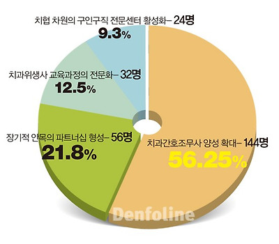 몇 해째 직원채용의 어려움을 호소하고 있는 개원가에서 보조인력 구인난을 해결할 방법으로는 반수 이상 56.25%에 달하는 가장 많은 수가 ‘치과간호조무사 양성 확대’를 바라고 있었으며, ‘장기적 안목의 파트너십 형성’과 ‘치과위생사 교육과정 전문화’로 답을 찾아야 한다는 응답이 각각 2, 3위를 차지했다.