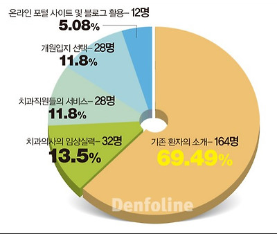 치과가 신환을 창출하기 위한 방법으로는 ‘기존 환자의 소개’가 가장 효과적이라는 응답이 69.49%로 압도적으로 높게 나타나 ‘기존 환자 관리’가 치과경영에 상당한 도움을 줄 수 있다고 보고 있는 것으로 조사됐다. 이어 ‘치과의사의 임상실력’이 중요하다고 생각한 응답이 그 뒤를 이었으며, ‘치과직원들의 서비스’와 ‘개원입지’도 중요한 요소로 꼽았다. ‘온라인 포털 사이트나 블로그 활용’은 의외로 5% 수준에 그쳤다.