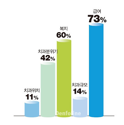 치과위생사가 가장 중요하게 생각하는 취업 조건으로는 급여(73%)와 복지(60%)를 최우선으로 꼽았으며, 치과분위기(동료 및 원장님 성향)가 42%로 그 다음을 차지했다. 그 밖에도 치과규모(14%), 치과위치(11%) 등도 고려하는 것으로 나타났다.(자료 제공 : 덴탈비타민) |