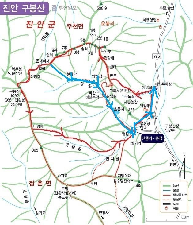 B팀: 구봉산주차장 →양명교 →1.2.3.4봉 →구름다리 →5.6.7.8봉 →돈내미재 →천왕암 →