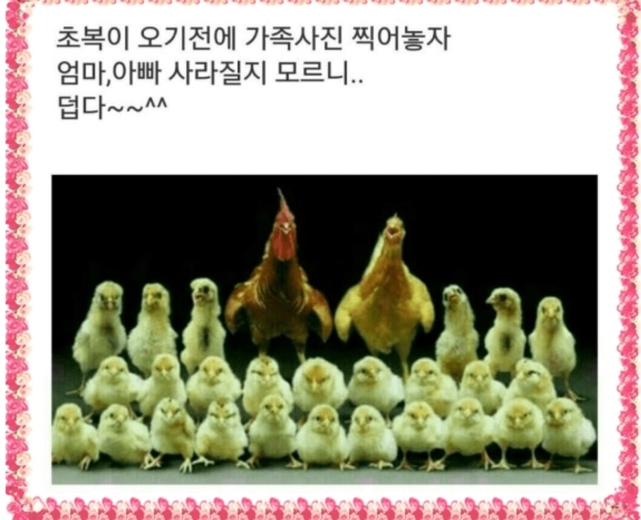 재미난 닭 유머시리즈를 준비하였습니다!! 잠시나마 웃으며 무더위 날려버리시고 즐거운 시간 되시길 바래유~~^^ 🐔 세상에서 제일 비싼 닭 🐔 --> 코스닭 😁 🐔 세상에서 제일 빠른 닭 🐔 --> 후다닭 😄 🐔 성질 급해 죽는 닭 🐔 --> 꼴까닭 😁 🐔 정신 줄 놓고 사는 닭 🐔 --> 헷가닭 😄 🐔 가장 섹시한 닭 🐔 --> 다 벗고 홀 닭 😍 🐔 가장 야한 수탉 🐔 --> 아무 때나 빨닭! 😁 🐔 집안 망쳐 먹은 닭 🐔 --> 쫄 닭! 😄 🐔 예전에 날리던 닭 🐔 --> 한 가 닭 😁 🐔 닭이 제일 싫어하는 말은? 🐔 --> 닭쳐!!! 😁 🐔 한성질 하는 닭 🐔 --> 미치고 팔닭!! 😄 🐔 마음 짠한 닭 🐔 --> 밑바닭 😄 🐔 싱싱한 닭 🐔 --> 파닭 파닭! 😍 🐔 만져보고 싶은 닭 🐔 --> 처녀 손바닭 😁 🐔 상사병 걸려 죽기 일보직전의 닭 🐔 --> 콩닭 콩닭 😁 🐔 가장 뜨거운 닭 🐔 --> 불 닭 😍 🐔금요일마다 불타오르는 닭 🐔 --> 불 닭 😁 🐔 가장 수다를 잘떠는 닭 🐔 --> 속닭 속닭 😄 이 닭 저 닭 해도 세상에서 제일 좋은 닭은? . . . . . 서로 등 두들겨주고 챙겨주는 '토닭토닭' 이겠쥬?^^ 《인간들은 정말 나빠~~》 어느 날 닭이 화가 잔뜩 나서 젓소에게 달려가서 씩씩대며 말했다. ●닭: "사람들은 정말 나빠~" ●젖소: "아니, 왜?" ●닭: "아니 자기들은 애를 하나~둘 밖에 안 낳으면서 우리에게는 매일 매일 알을 많이 낳으라고 하잖아" 그러자 젖소가 하는 말... ⬇⬇⬇⬇⬇ ⬇⬇⬇⬇ ⬇⬇⬇⬇ ⬇ "야~그건 아무것도 아니야! 수도 없이 많은 인간들이 내 젖을 먹었어도, 나 보고 엄마라고 부르는 사람은 한 사람도 없잖아” ㅠㅠ 《 날 잡아 먹어라 》 폭등하는 사료값을 견디지 못한 양계장이 망했다. 남은 것이라고 달랑 닭 세 마리. 배고픔을 더 견디지 못해 양계장 주인은 닭을 잡아 먹기로 했는데... 단 한 마리라도 좋은 종자를 남겨 놓기 위해서 닭 세 마리에게 문제를 내어 문제를 못맞추는 가장 머리 둔한 놈을 잡아 먹기로 했다. 첫 번째 닭에게 '1+1 은 몇이냐?' 고 질문했다. 그러자 첫번째 닭은 주인을 장난 하냐는 듯이 쳐다보더니 '2'라고 대답했다. '음! 그넘 신통하게 잘 맞추네.' 이번에는 두 번째 닭에게 약간 어렵게 문제를 내었다.'2 x 2 는?' 두 번째 닭은 너무 쉽다는 듯이 하품을 하며 '4요.' 이에 양계장 주인은 화들짝 놀라지 않을 수 없었다. 이제 마지막 세 번째 닭이 문제를 맞혀버리면 굶어 죽을판이 되였다. 그래서 이번에는 비상 수단을 섰다. 마지막 닭에게 '19587395798374297 x 24785346891593739 는 답이 뭐게?' 그러자 마지막 세 번째 닭이 주인을 올려다보며 하는말... ⬇⬇⬇⬇⬇⬇⬇⬇⬇⬇⬇⬇⬇⬇⬇⬇⬇⬇ "털 뽑아! 차라리 날 잡아 먹어라! ┏ ∥ ┓ * 웃어요. ┃ 보┃ * 이거쭈~욱┃ 약┃ * 드시고 ┗━-┛ *남은세월 ♨♨♨ 건강히 보내세요~~^^ |