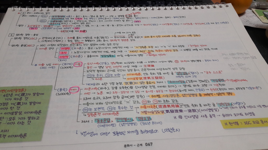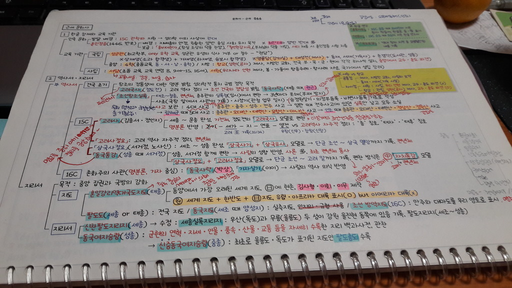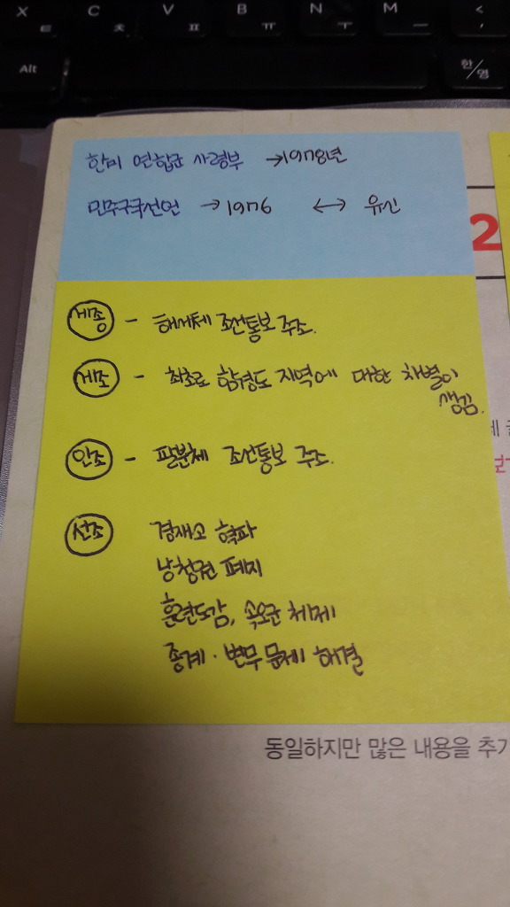 여백 공간에 제 나름 예를 들어 필노에 없는 조선 중종의 문화사 쪽의 업적 등등을 적었고 포스트잇에도 제 나름 정리한 것들을 적어두었습니다. 이렇게 정리를 하는 것이 암기를 하는 데 도움이 되었습니다.