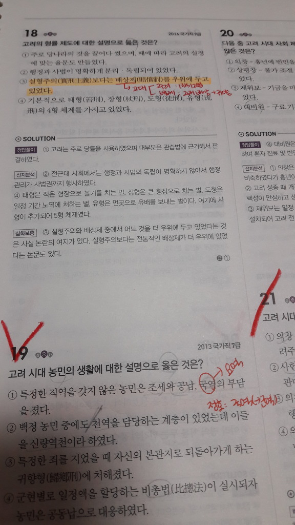 사진에서 보시다시피 문제를 푼 것을 표시하지 않고 틀린 것, 모르는 것, 맞히긴 했는데 확실히 알고 맞힌 게 아닌 것을 표시했고 모르는 선지는 형광펜으로 표시하고 일단은 넘어갔습니다. 여기서 중요한 것은 선지 하나 하나 다 분석하며 푸는 것입니다. 필기노트, 기본서와 같은 개념이 정리된 책을 찾아보면서 선지 하나 하나 다 제 것으로 만들려고 했습니다.