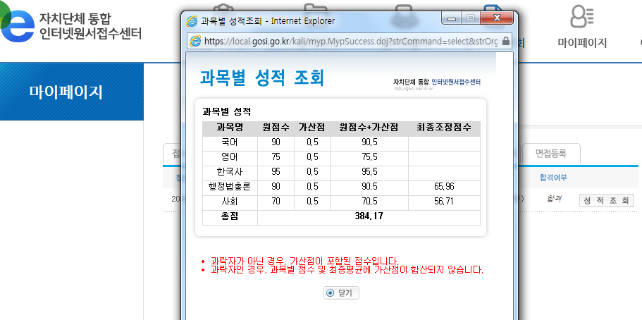 4. 성적 : 2015 국가직(국어 50, 영어 50, 한국사 75, 행정법 100, 사회 65)
