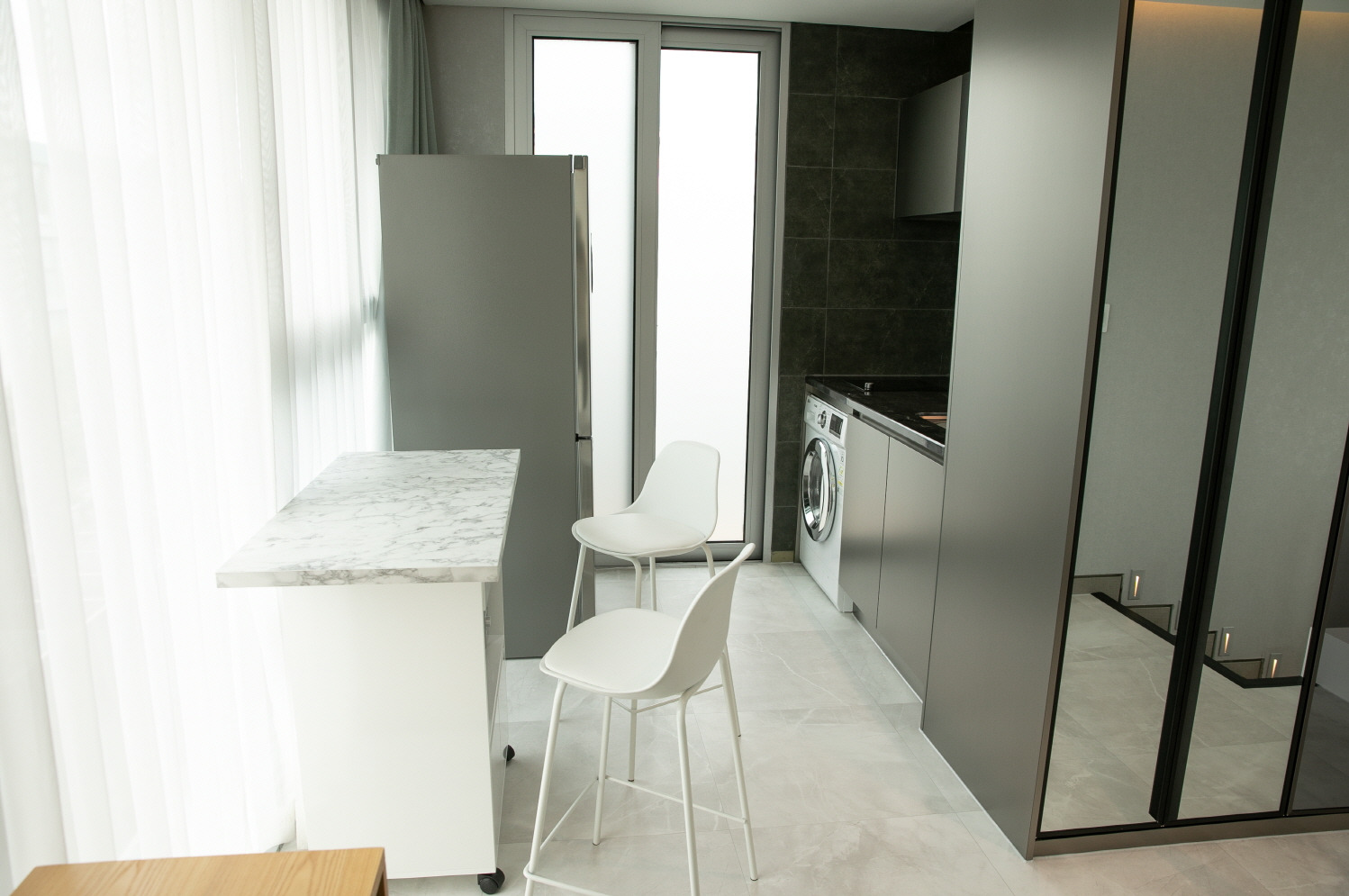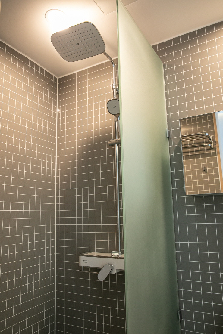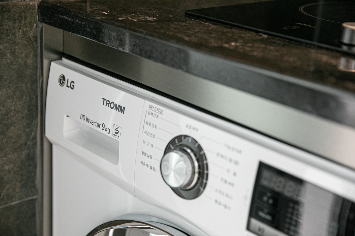 옵션: 붙박이장2개, 이동형 아일랜드식탁, 의자2개, 다이슨 공기청정기, 청소기, 전자레인지, 침대, 호텔형 기본침구, 드럼세탁기, TV, 인덕션, 냉장고, WIFI, 천장형 시스템 냉온풍기, 신발장, 구두헤라, 침실협탁, 무드등, 기본식기 (욕실,주방은 하츠와 아메리칸스탠다드 브랜드로 설치되어 있음)