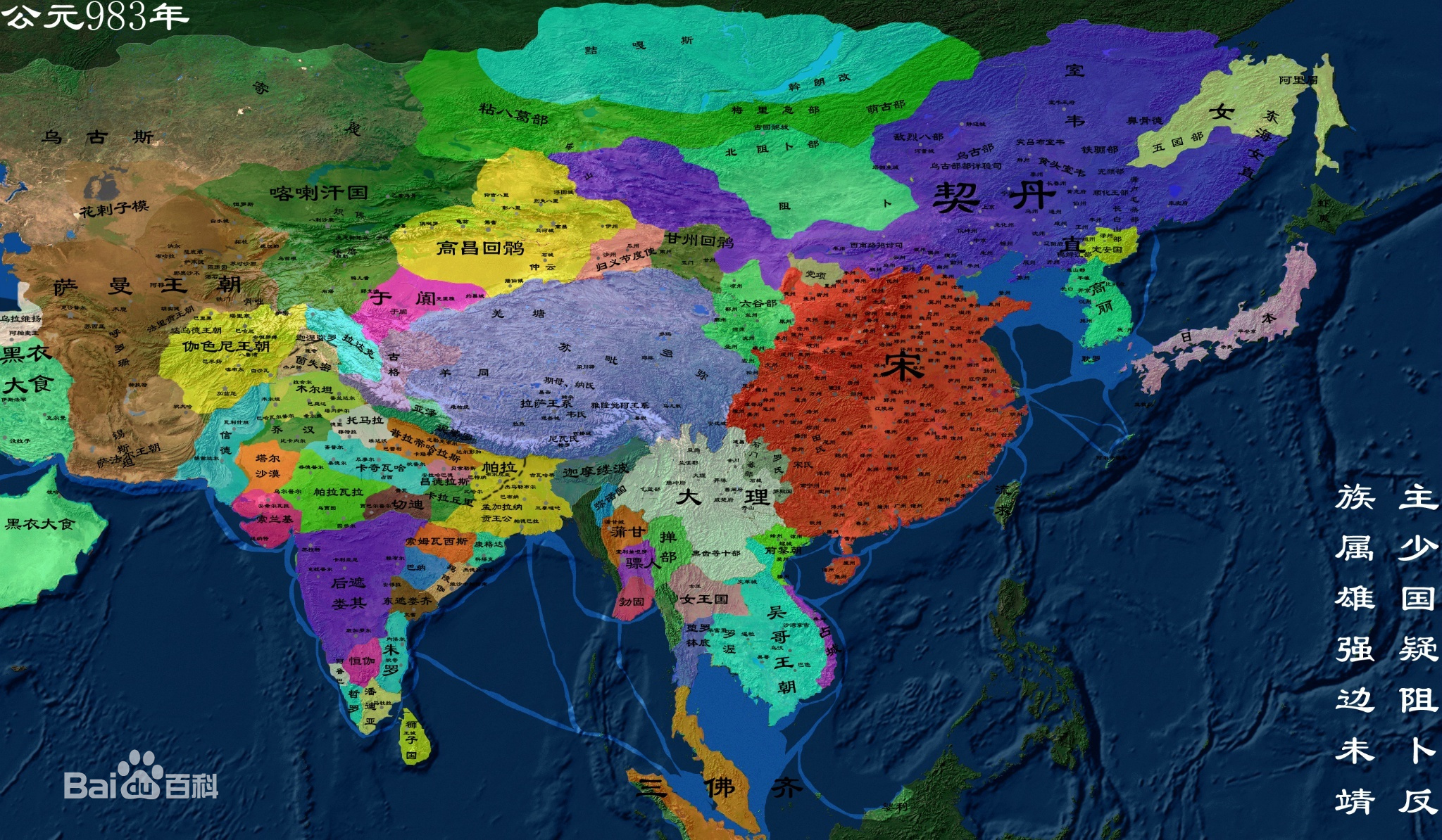 北宋和唐的民族政策不同,有契丹族建立的辽政权,都城在临潢(内蒙巴林左旗附近)在它的西北边,有党项族(羌族的一支)建立的夏政权(西夏),都城在兴庆(宁夏银川市)。此外,还有云南的大理,西藏的吐蕃以及西北的高昌、龟兹、于阗等政权。