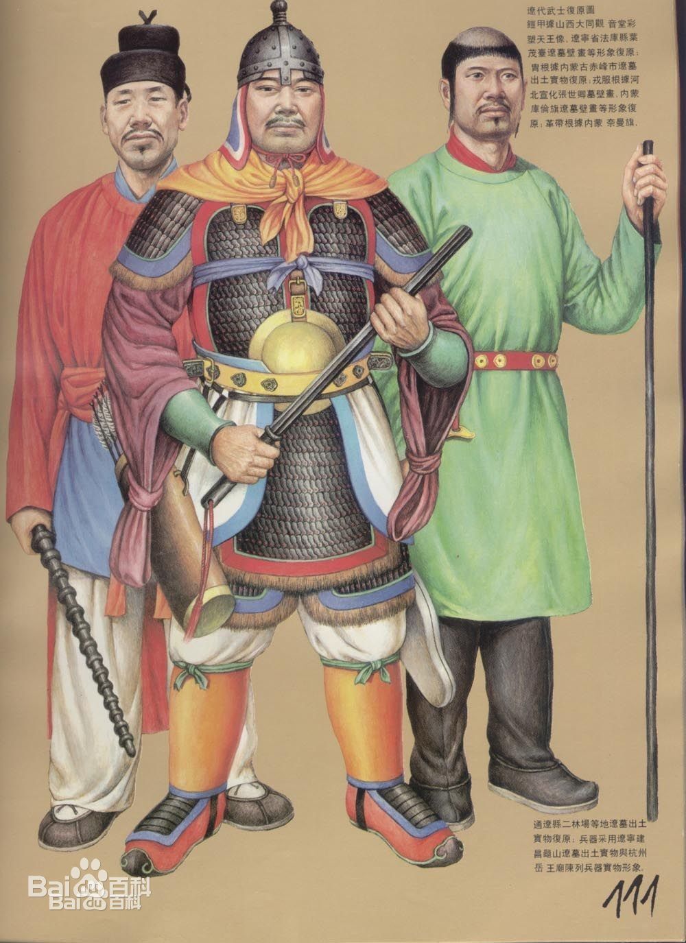辽军大体分为宫帐军﹑部族军﹑京州军和属国军。宫帐军,征集直属皇帝的着帐户壮丁组成,是契丹族亲军,供宿卫和征战,“以行营为宫,选诸部豪健千人,置腹心部 [45] ”。部族军,主要由契丹以外的部族壮丁组成,供守卫四边。以上两种部队是辽军的主力。京州军,亦称五州乡军,征集五京道各州县的汉族﹑渤海族等的壮丁组成。属国军,由臣属国壮丁组成。后两种部队为辅助兵力 [32] 。辽初,贵族男子人人服兵役,年龄在15~50岁之间的列籍正军,兵器﹑战马自备 [46] 。“正军一名,马三匹,打草谷﹑守营铺家丁各一人”,“人马不给粮草,日遣打草谷骑四出抄掠以供之”(《辽史·兵卫》)。后来,“沿边各置屯田戍兵,易田积谷以给军饷。”(《辽史·食货》)辽军以骑兵为主,主要武器是弓箭和刀枪。后期从宋朝传入抛石机式的火炮,编有炮手军 [32] 。