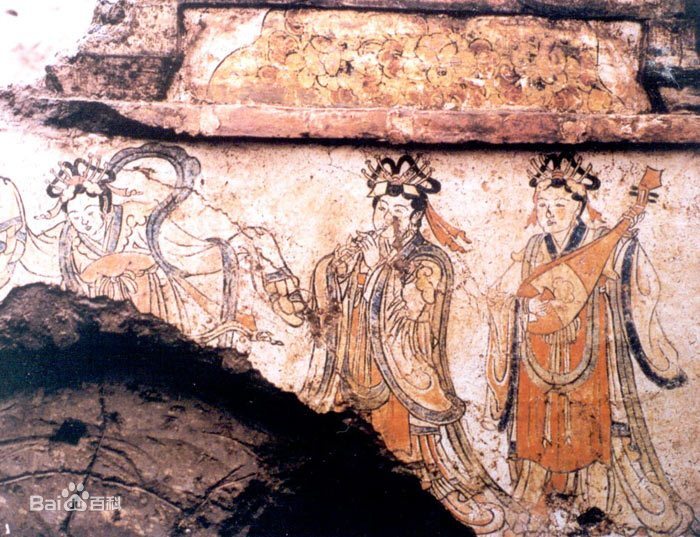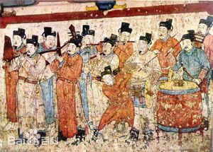 辽朝散乐受唐朝和五代后晋影响极深,在此基础上与契丹族民间艺术相融合,建立起的一种类似宫廷音乐的形式。《辽史》中有记载,其演奏乐器有:觱篥、箫、笛、笙、琵琶、五弦、箜篌、筝、方响、枝鼓、第二鼓、第三鼓、腰鼓、大鼓与拍板等。散乐由12人组成,是一支完整的表演队伍。乐队呈两排,前排第三人下,有一低矮的舞蹈者,随着节拍翩翩起舞 [32] 。