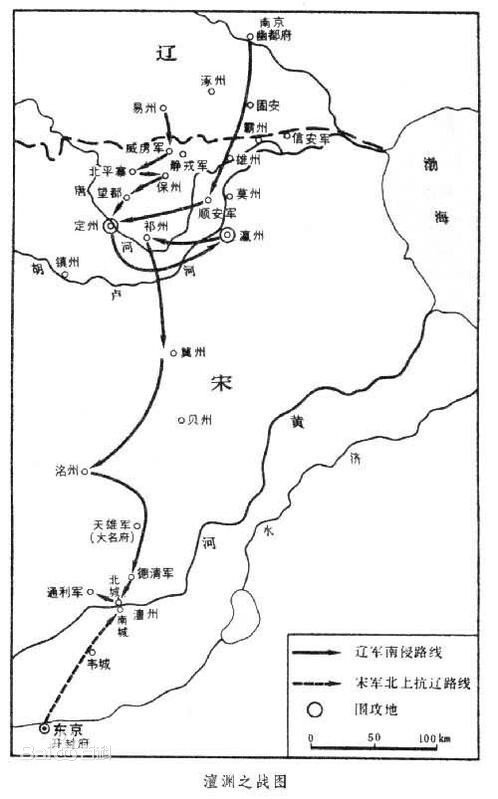 북송은 건국 초기 연운 16주를 되찾겠다는 의지로 979년과 986년 두 차례에 걸쳐 북벌(北伐)을 함락시켰다.요 성종은 고려가 북송과 동맹을 맺는 것을 막기 위해 동부를 위협하기도 했다.993년 고려 거란전쟁을 일으켜 고려에 항복한 뒤 1009년 동정(東政) 때 가장 멀리 고려 개성에 입성했다.이후 요송(遼宋) 간의 오랜 대립을 해결하고 거란 귀족의 황권(皇權) 위협을 피하기 위해 소태후와 요성종은 1004년 친(親) 대군을 이끌고 송경(宋)으로 들어갔다.송진종은 적을 두려워하여 수도를 옮기고 남쪽으로 도망치려 하였으나, 재상이 도준을 고집하여 친히 전주(현재의 복양)에 이르러 독전하였다.송군은 사기를 진작시켜 요군의 공격수를 격파하였으며, 요장 소태름은 전사하였다.요군은 공복에 적을 당할까 두려워 평화 조약을 제의하였다.주화(主和)인 송진종(宋眞宗)은 다음 해 초에 요(遼)과 화약을 체결하고, 송(宋)은 매년 10만 냥, 견(绢) 20만 필을 요( 。)로 증정하여 서로 경계를 지키고 서로 간섭하지 않으며, 형제의 나라가 되었다고 협정한 것이 바로 전연의 맹세로, 그 후일조(朝日)는 120년에 이른다.이후 요성종이 서하를 맺었고, 서하 역시 송·요 사이를 휘저으며 그림을 그리며 요송하 삼조의 정국을 이루었다[34] [37].