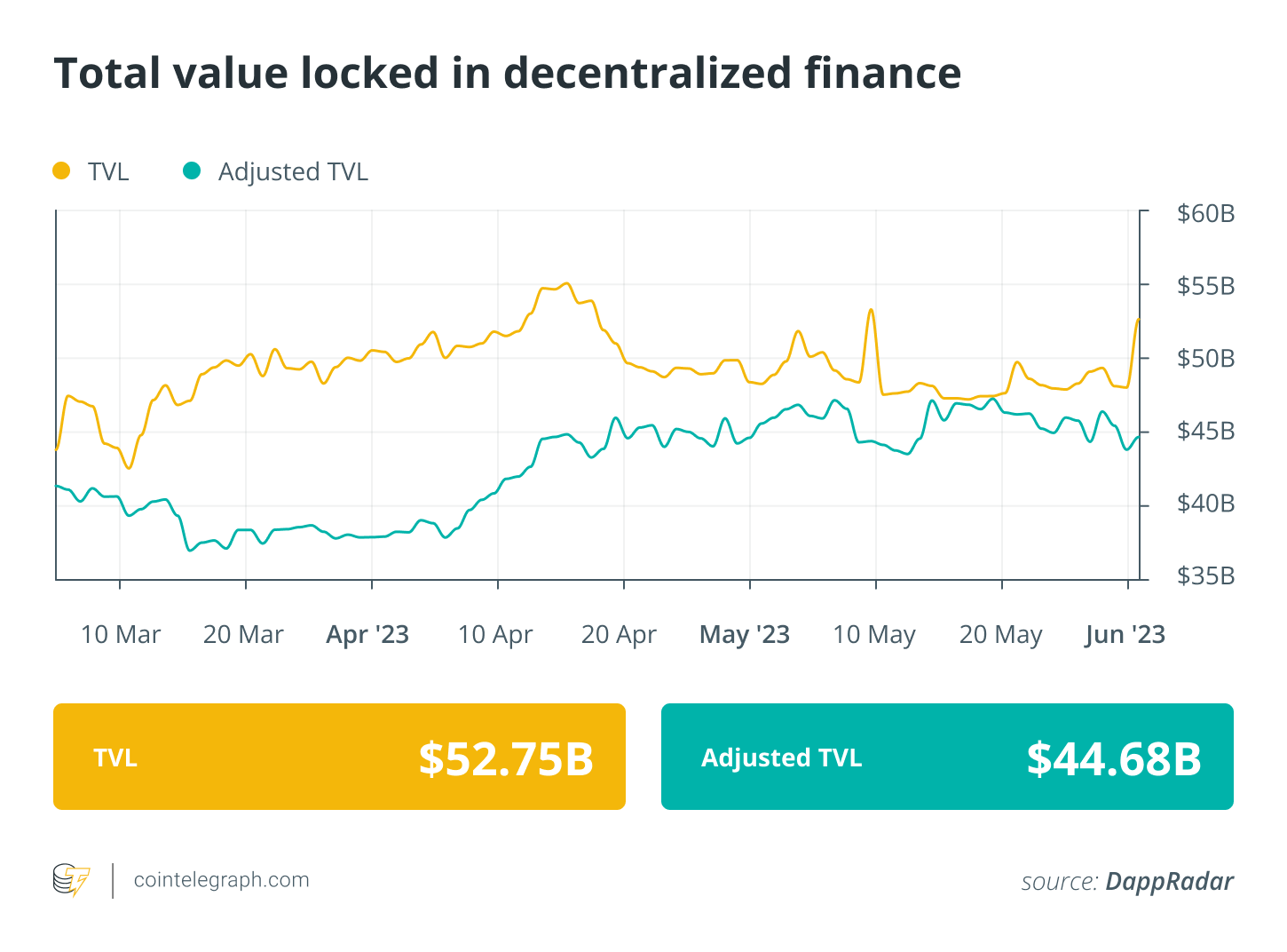 DeFi의 총 시장 가치는 지난주에 강세를 보였습니다. 코인텔레그래프 마켓 프로(Cointelegraph Markets Pro)와 트레이딩뷰(TradingView)의 데이터에 따르면 시가총액 기준 디파이(DeFi)의 상위 100개 토큰은 강세를 보였으며 대부분의 토큰은 녹색으로 거래되었습니다. 디파이 프로토콜에 예치된 총 가치는 50억 달러를 넘어섰습니다.