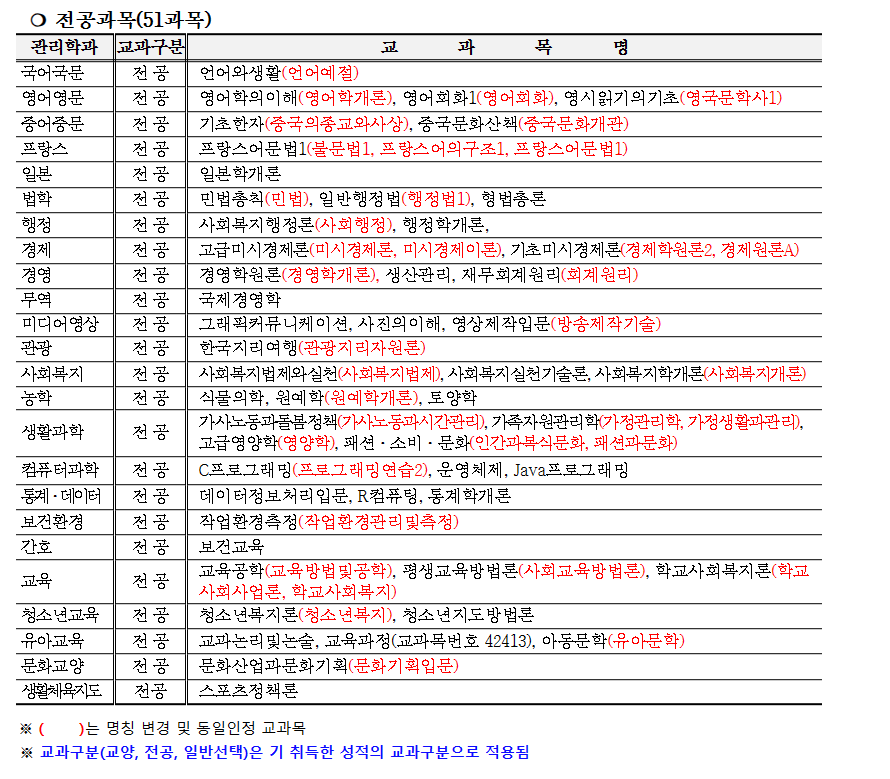 | 2023학년도 동계 계절수업 개설교과목 안내 2023학년도 동계 계절수업 개설교과목을 다음과 같이 안내하오니, 2023학년도 2학기 수강신청 시 참고하시기 바랍니다. 1. 하계 계절수업 개설교과목: 62과목 (교양 11과목, 전공 51과목) ※【붙임】 참조 2. 참고사항 ❍ 수강신청대상자: 1학기 개설 교과목 중 이미 취득한 교과목의 성적이 C+이하이거나 F학점인 교과목에 대하여 성적향상 및 학점취득을 희망하는 재학생, 휴학생 ※ 기존 교과목 성적 C+∼D0 : 성적 향상만 가능, 추가 학점 취득 불가 / 기존 교과목 성적 F : 학점취득 및 성적향상 가능 ❍ 수강신청기간: 2023. 10. 10.(화) ~ 10. 16.(월) ❍ 수강신청 가능 교과목 수: 3과목(9학점) 이내 ❍ 수강료: 과목당 25,000원 2023. 7. 한국방송통신대학교 총장 |