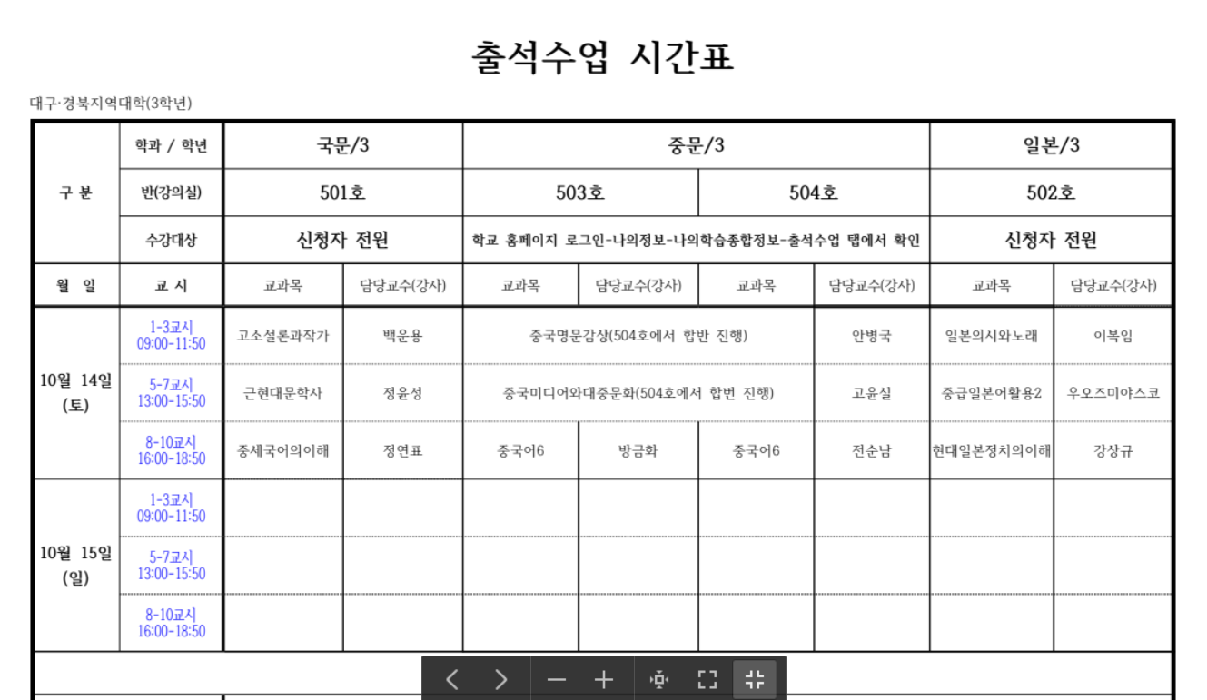 2) 홈페이지 로그인➩ 학사정보➩ 수업/시험➩ 수업및시험정보조회➩ 수업시험구분에 '출석수업' 선택 후 조회