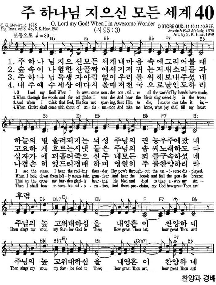 태양이 찬란히 빛나고 숲속의 새들이 기쁘게 노래했습니다. 그는 이 정경에 감격하여 “오! 위대하신 하나님”이라는