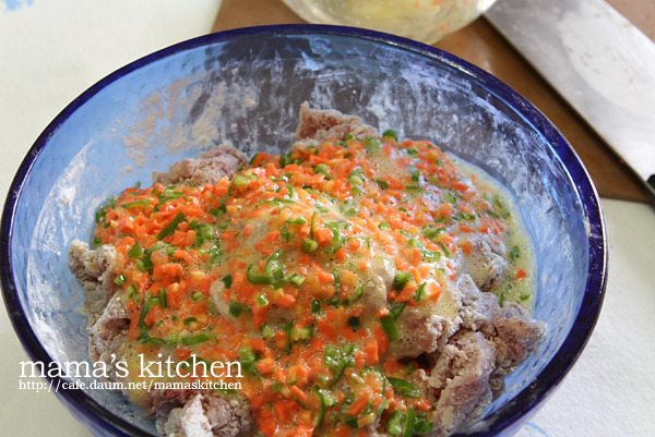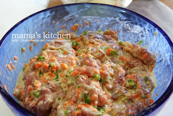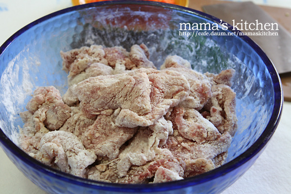 충분히 양념에 재어진 고기에 녹말 가루를 입혀줍니다~