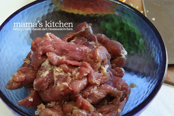 먼저 돼지고기는 넓적하게 저며 간장, 미림, 다진 마늘, 후추, 참기름에 재웁니다...ㅋㅋㅋ