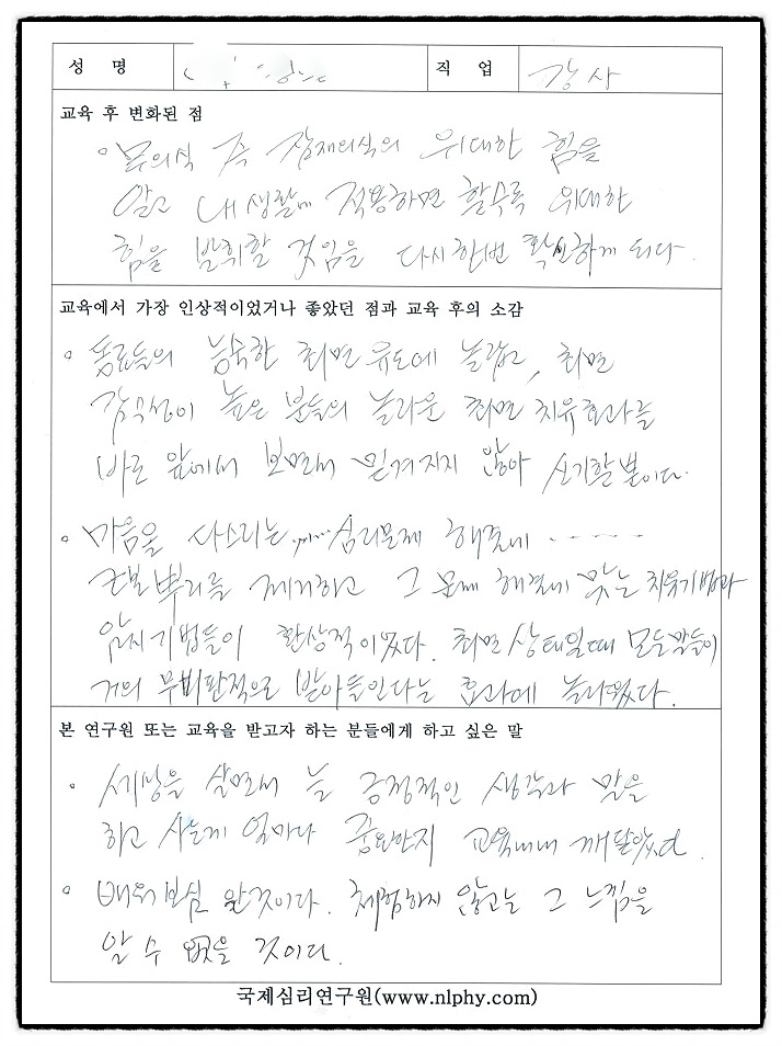 무의식의 위대한 힘 적용에 대한 삶의 큰 변화, 치유기법 암시기법들이 환상적,체험하지 않고는 그 느낌을 알수 없을것 같음(최면1급후기)