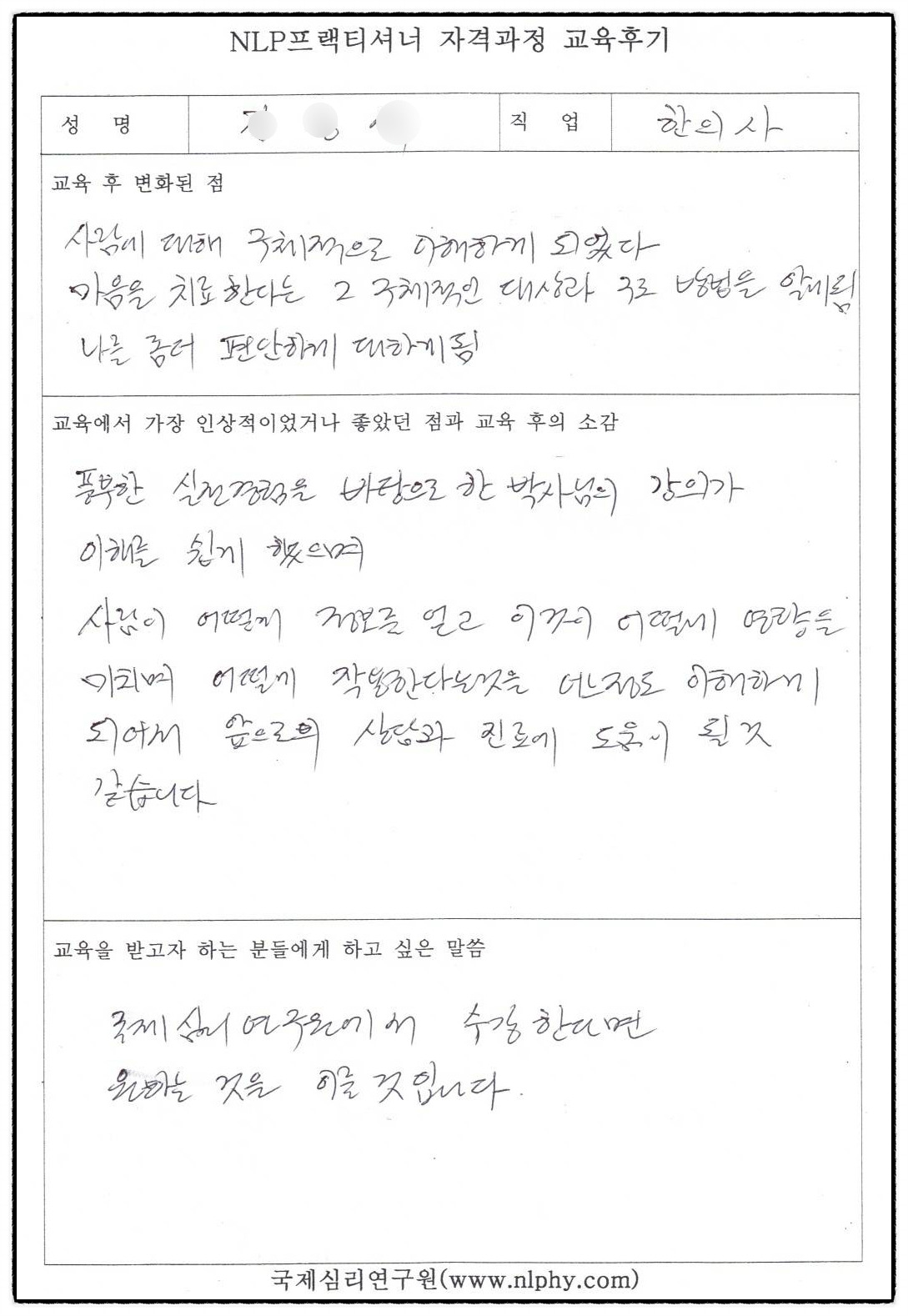 풍부한 실전경험 통한 강의는 이해하기 쉬웠으며 마음 치료 위한 구체적인 구조방법 및 상담과 진로에 도움됨(NLP교육 한의사) 작성자희망|작성시간25.12.23|조회수0 목록 댓글 0 글자크기 작게가 글자크기 크게가 풍부한 실전경험 통한 강의는 이해하기 쉬웠으며 마음 치료 위한 구체적인 구조방법 및 상담과 진로에 도움됨(NLP교육 한의사) 다음검색 현재 게시글 추가 기능 열기 북마크 공유하기 신고 센터로 신고 댓글 댓글 0 댓글쓰기 답글쓰기 댓글 리스트