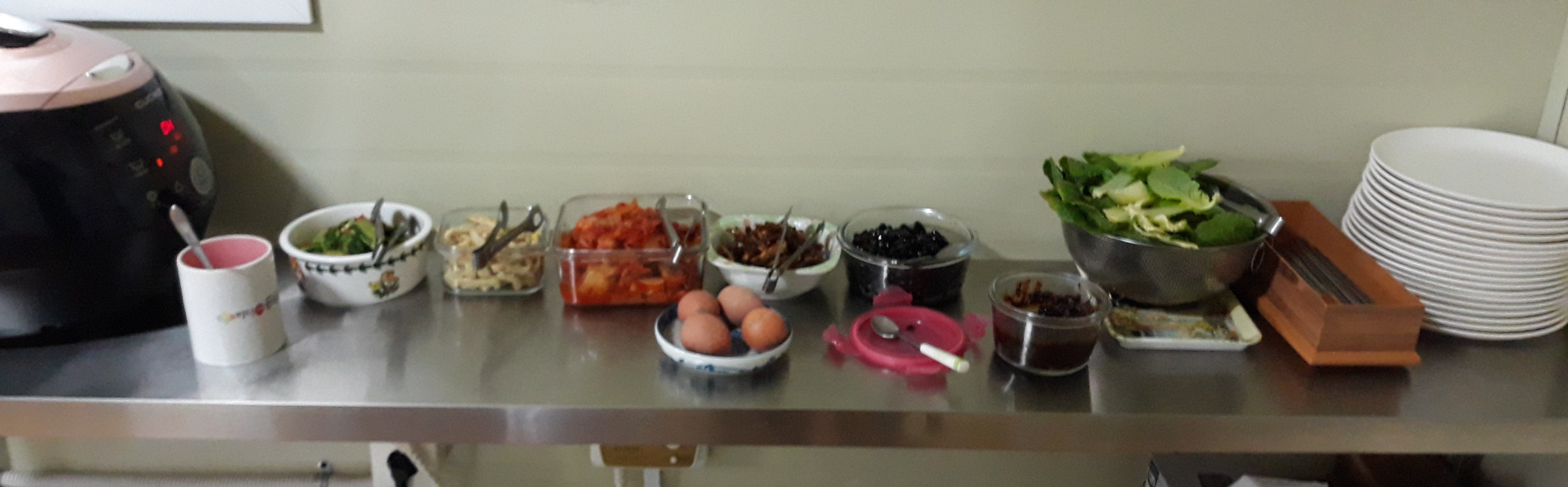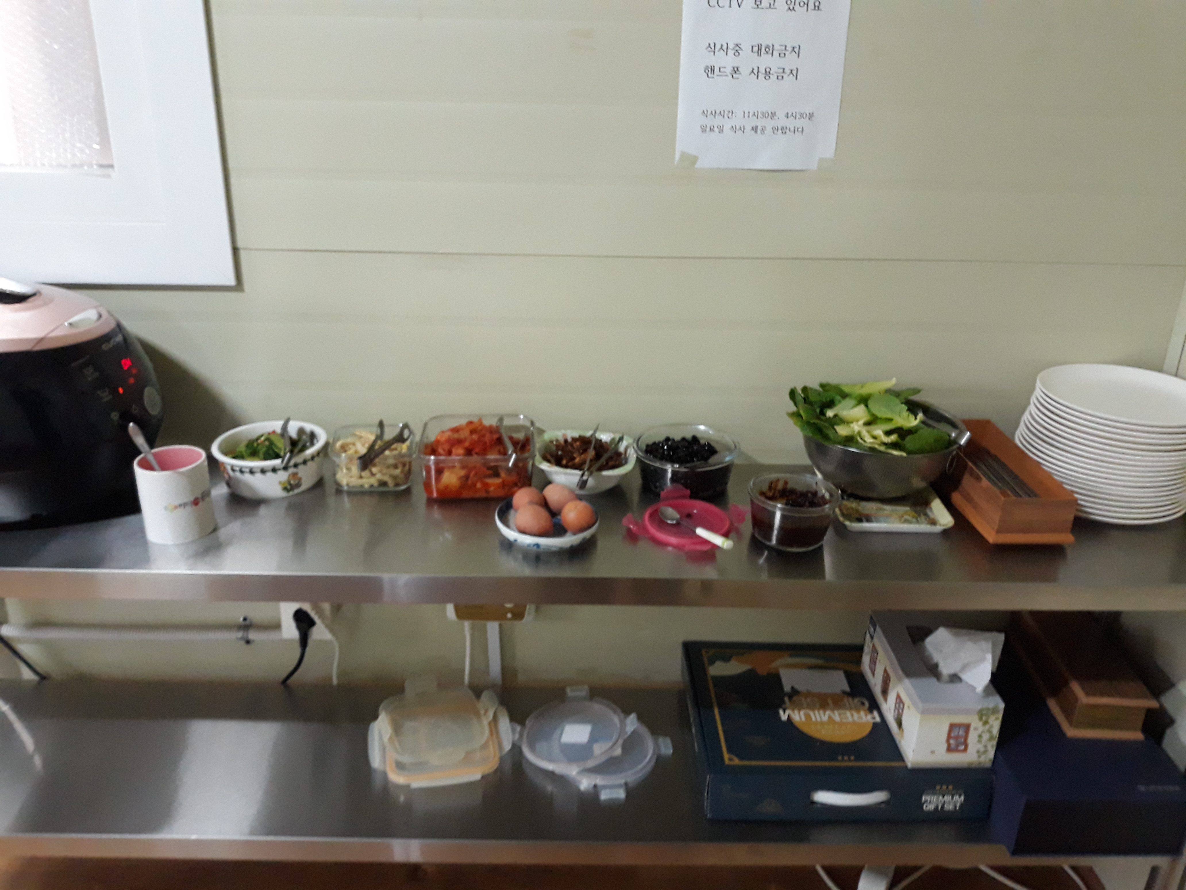 식사는 자율배식으로 필요한 만큼만 접시에 덜어서 먹습니다. 식사장소도 cctv가 보고 있어요