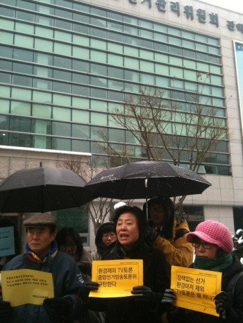 | ▲ 핵없는사회를위한공동행동, 4대강복원범국민대책위원회, 4대강조사위원회, 한국환경회의는 12월 7일 오전 10시 사당역에 위치한 중앙선거방송토론위원회 앞에서 2차 TV토론에서 '환경'의제가 제외된 것에 항의하는 기자회견을 갖고 있다 | |