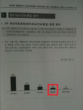 앞의 두 가지 경제 분야와 일자리와 고용안정 방안은 서로 연관된 내용이다. 합쳐서 두 가지로 충분히 줄일 수 있는 부분이다. 지난 5년 동안 대기업 수출은 늘어도 경제가 힘들었던 이유가 무엇인가. 대기업 중심의 경제 및 산업구조를 해소하고 비정규직 문제를 해소하는 것을 통해서 경기 침체를 해결할 수 있다. 박근혜 후보나 문재인 후보나 비슷한 답이 예상되는 재미없는 주제를 가지고 토론하겠다는 선거관리위원회의 의도가 무엇인지 궁금하다.