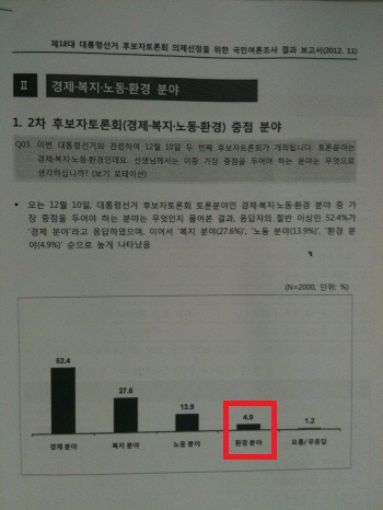 경제민주화도 복지공약도 비슷한 두 유력 후보를 구분할 정책은 현재까지 '환경'뿐이다. 그런데 중앙선거관리위원회와 중앙선거방송토론위원회가 이 기회를 박탈하고 있는 것이다.