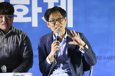 고등학교에서 사회를 가르치는 조창완 선생님은 이번 대입제도 개편안을 듣고 “오랫동안 사랑한 여인으로부터 실연을 당한 기분”이었다고 밝혔습니다. 수능이 30%로 확대된 것은 그 이상의 의미가 있다는 점을 지적했습니다. 수시에서도 수능최저기준이 있기 때문에 현재에도 전국 모든 고3 교실에서 EBS문제풀이 수업이 이뤄지고 있는데, 이것이 30%까지 확대되면 실제로는 70-80%까지 늘어날 것이라는 우려였습니다. 또 가장 아쉬운 점으로는 ‘고교학점제’의 실종을 꼽았습니다. 고교학점제라도 살아난다면 그것을 지렛대 삼아 내신 절대평가를 주장하고 2025 대입제도를 희망적으로 볼 수 있었는데 고교학점제 도입이 유예되면서 그 논의조차 물 건너가게 되었기 때문입니다. 마지막으로 “이 자리에 모인 우리는 교사이고 부모이다. 침몰하는 우리 교육을 놓고 어떻게 가만있겠나. 그래서 이 자리에 모인 것. 이거라도 해야지, 우리가 할 수 있는 뭐라도 해야 우리 아이들을 볼 수 있는 면목이 생긴다. 우리가 조그만 촛불, 조그만 노력이라도 함께 하자”며 끝까지 함께 힘을 모으자고 당부하였습니다.
