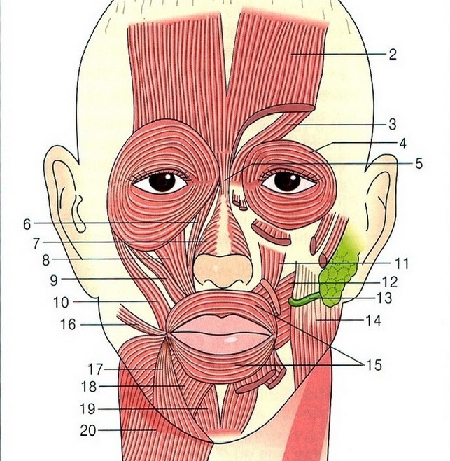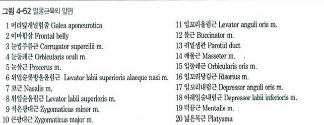그리고 11번, 12번 그리고 아주 넓게 보자면 14번 근육까지도 가능성이 있죠. 아무튼 그곳이 지나치게 경직되어 있다면 눈은 아래로 처지게 되고 입은 당겨 올라가게 됩니다. 그렇지 않고서는 그 현상을 설명할 수 가 없어요.