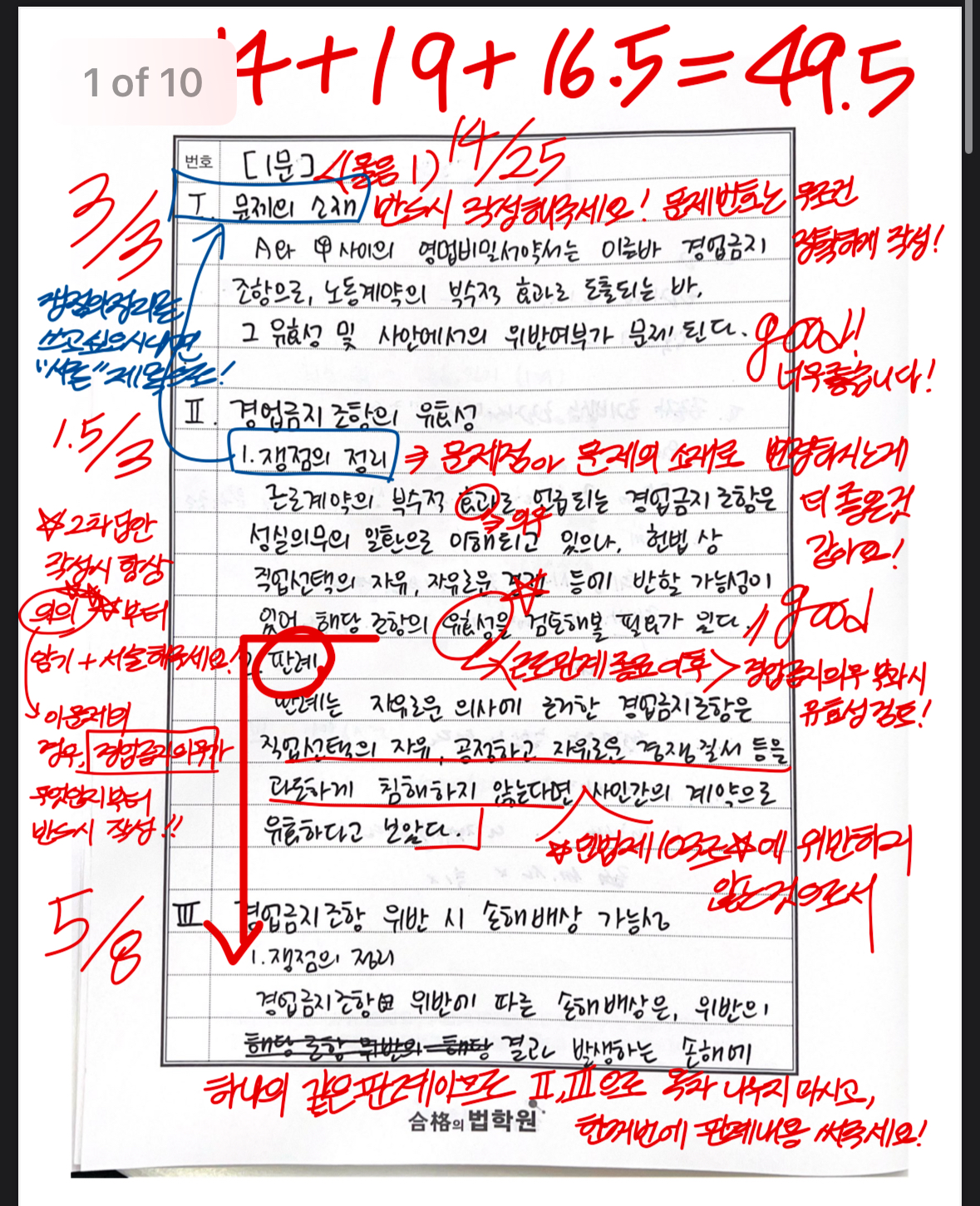 노동법 크게 논탈하고, 인사에선 처음보는 개념을 물어보는데 장단점 절차를 영문명만 보고 지어쓰고 (문항점수 11점...- 각 교수님들이 25점 만점에 4점쯤 주신 겁니다), 행쟁에선 25점에 5쪽 넘게 쓰고도 9점 받고..그러기도 했지만, 다른 수험생들도 그래서인지 그래도 각 과목 전체 점수는 그래도 엄청 나쁘진 않더라구요. 이런 감(이정도 쓰면 붙는구나)을 얻을 수 있는 귀한 실전 기회였다고 생각합니다.