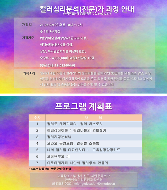 컬러심리분석(전문)가 과정 안내 작성자사상평생교육원|작성시간21.04.27|조회수55 목록 댓글 0 글자크기 작게가 글자크기 크게가 다음검색 현재 게시글 추가 기능 열기 북마크 공유하기 신고 센터로 신고 댓글 댓글 0 댓글쓰기 답글쓰기 댓글 리스트