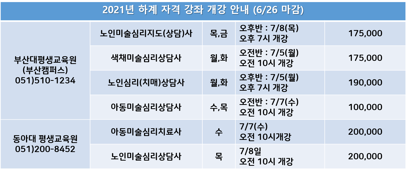 부산대동아대 평생교육원 강좌 안내 작성자사상평생교육원|작성시간21.06.16|조회수44 목록 댓글 0 글자크기 작게가 글자크기 크게가 다음검색 현재 게시글 추가 기능 열기 북마크 공유하기 신고 센터로 신고 댓글 댓글 0 댓글쓰기 답글쓰기 댓글 리스트