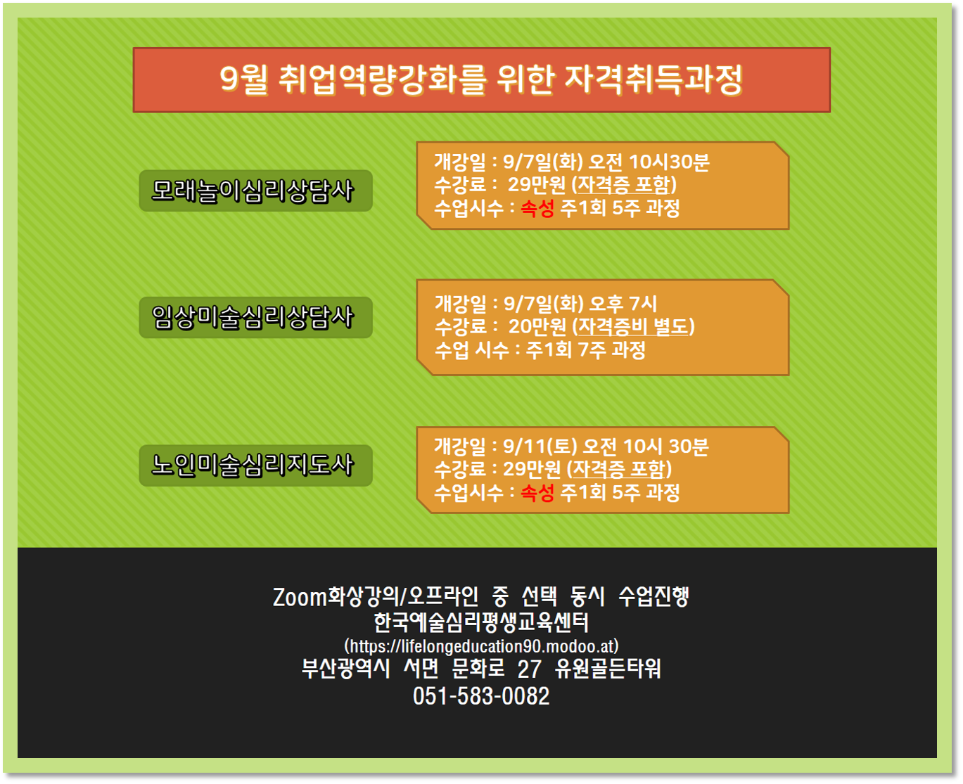 9월 취업역량강화를 위한 자격취득과정 작성자사상평생교육원|작성시간21.07.20|조회수47 목록 댓글 0 글자크기 작게가 글자크기 크게가 다음검색 현재 게시글 추가 기능 열기 북마크 공유하기 신고 센터로 신고 댓글 댓글 0 댓글쓰기 답글쓰기 댓글 리스트