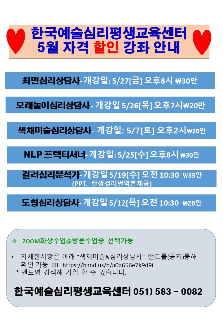 << 한국예술심리평생교육센터 5월 자격할인강좌 안내 >>