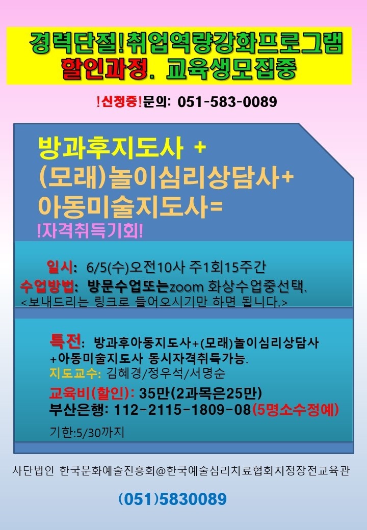방과후아동지도사 ++ (모래)놀이심리상담사 ++ 아동미술지도사 자격취득기회!!! 일시 : 6월5일(수)오전10시 주1회 15주간 수업방법 : 방문수업 또는 ZOOM화상수업중 선택 <보내드리는 링크로 들어오시기만하면 됩니다> 특전: 방과후아동지도사 + (모래)놀이심리상담사 +아동미술지도사 동시자격취득가능 지도교수: 김혜경/정우석/서명순 교육비(할인): 35만(2과목은25만) 부산은행: 112-2115-1809-08(5명소수정예) 기한:5월30일까지 *사단법인 한국문화예술진흥회 한국예술심리치료협회지정 장전교육관* 문의 : 051-583-0089
