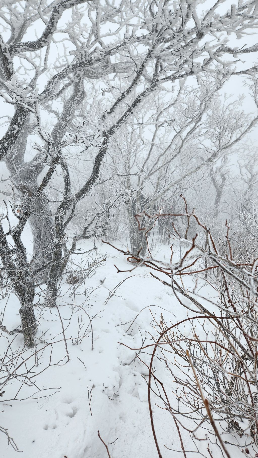 정상 부근 주목 단지에서 상고대가 피어있는 주목을 배경으로 사진찍기에 여념이 없다. 근래 보기 드문 상고대의 전경이다.