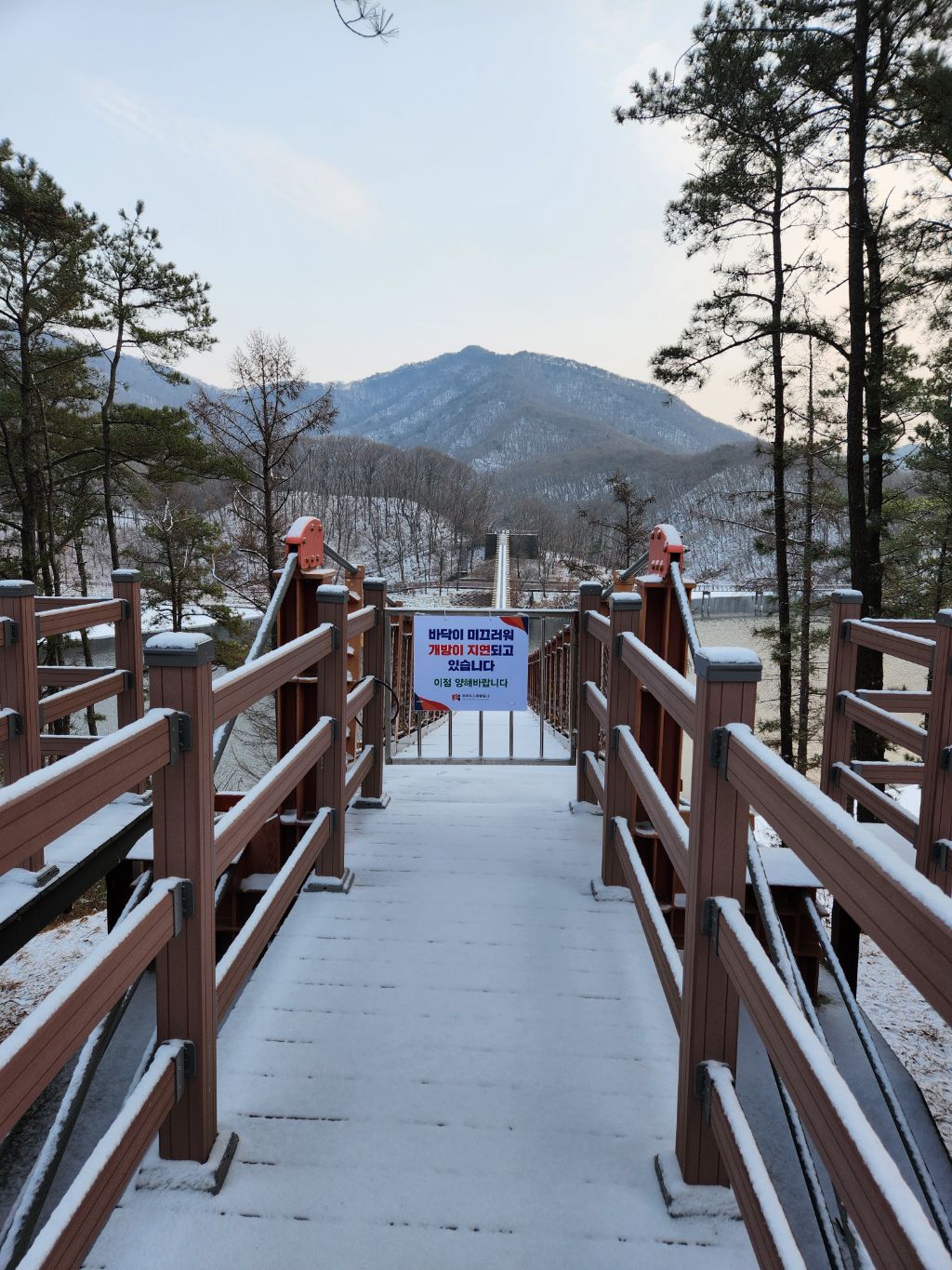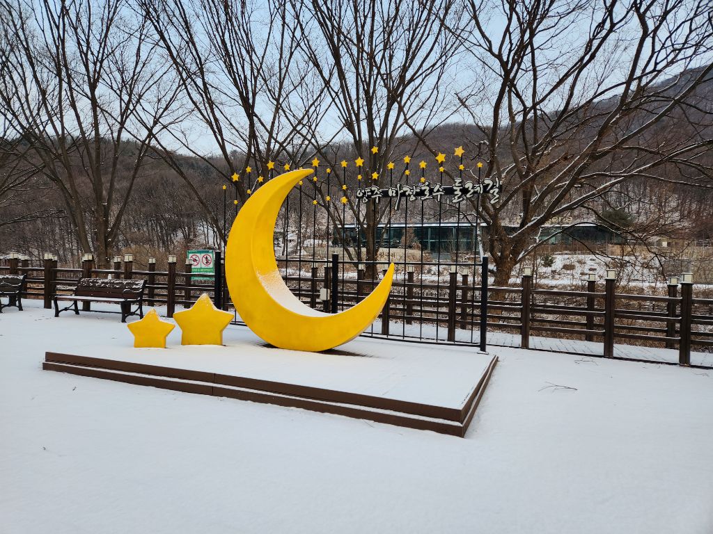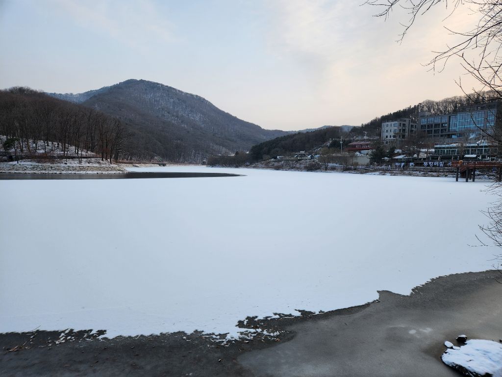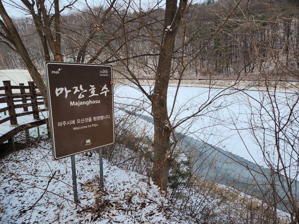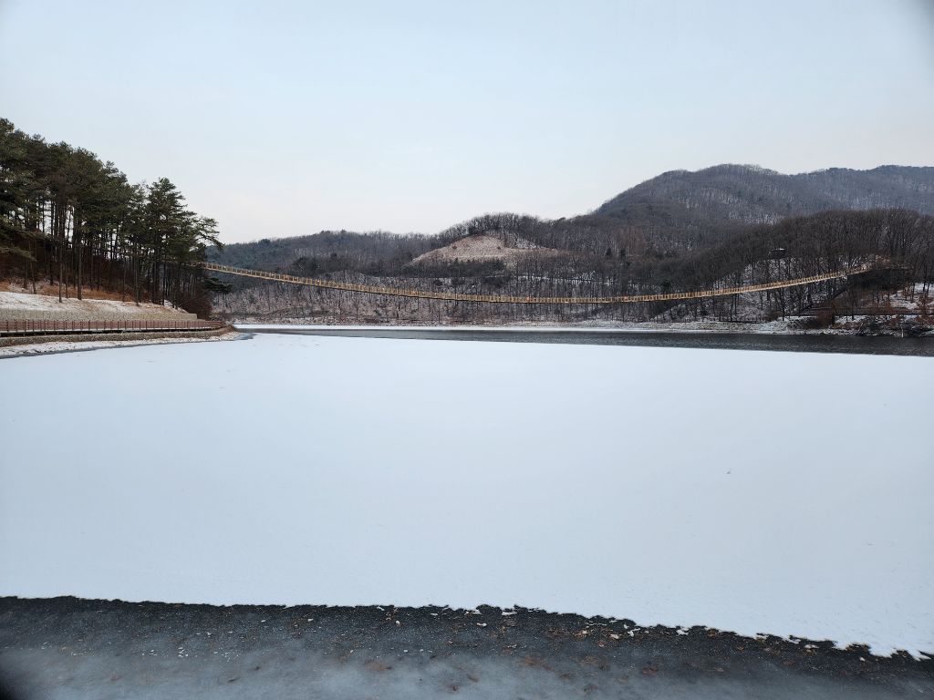 아세안휴양림에서 마장호수변 북단까지는 약 15분 정도 소요된다. 어젯밤 내린 눈으로 아름다운 설경이 끝없이 펼쳐진다. 마장호수 출렁다리는 9시 이후 오픈이기에 이번에는 통과하지 못했다.