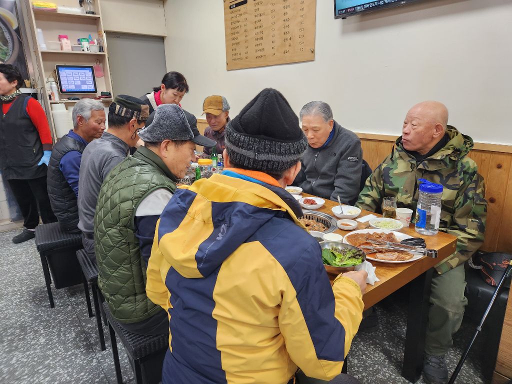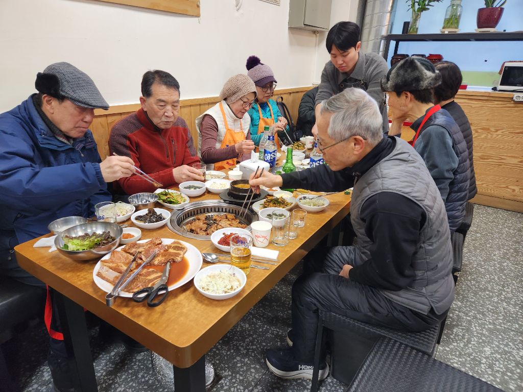 2026. 2. 7일 강산회 천장산 산행을 마치고 한국국방연구원 맞은편 골목길에 있는 마포숯불갈비에서 돼지갈비에 소맥 곁들이며 된장찌개로 점심식사.
