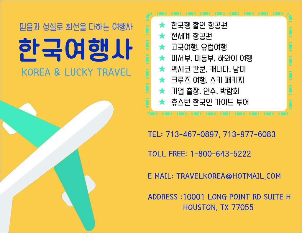 한국여행사 - 가을 비수기 한국행 항공권세일 작성자휴스턴 한국여행사|작성시간19.06.21|조회수179 목록 댓글 0 글자크기 작게가 글자크기 크게가 안녕하세요 한국여행사입니다.가을 비수기 한국행 비수기 세일중입니다.전화 혹은 이메일로 문의주세요감사합니다. 다음검색 현재 게시글 추가 기능 열기 북마크 공유하기 신고 센터로 신고 댓글 댓글 0 댓글쓰기 답글쓰기 댓글 리스트
