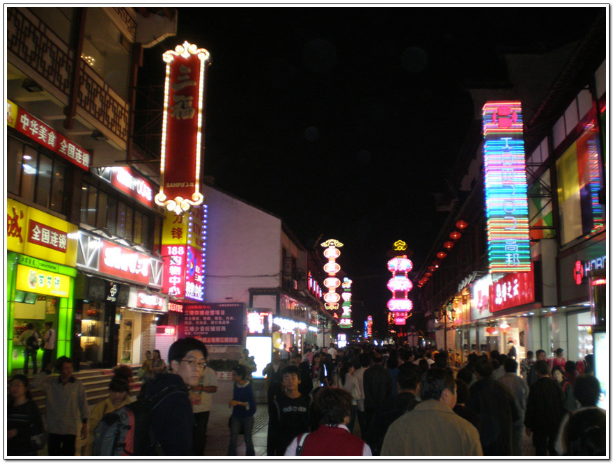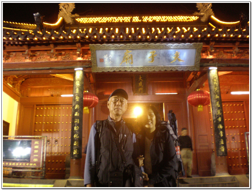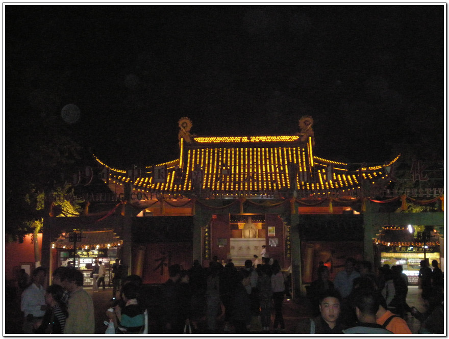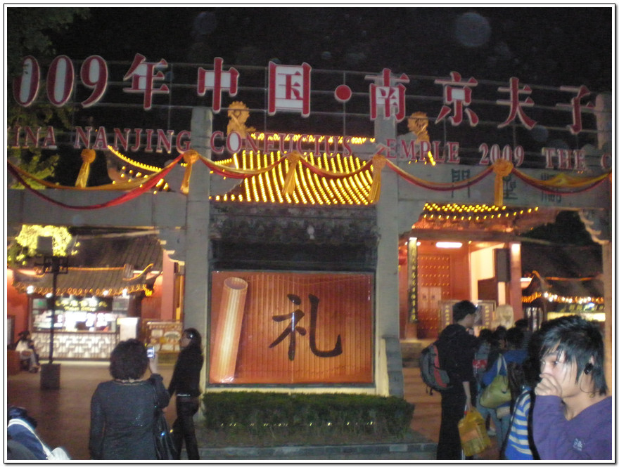 . 남경시 중심, 진회하(秦淮河 진후와이허) 강변에 위치한 남경부자묘는 중국 고대 저명한 대 사상가이면서 교육자인 공자(孔子)를 공양하고 제사지내기 위한 곳이다. 부자묘라는 이름은 공자가 옛날부터 사람들에게 존경의 의미로 '공부자'라 불리어 왔는데, 그 이름에서 따와 붙인 것이다. 중국 각 도시에 퍼져있는 크고 작은 공묘중의 하나로 규모는 곡부의 공묘에 비하면 보잘 것 없지만 강남을 대표하는 고건축물이면서 남경의 대표적인 관광성지라 한다. . 수많은 인파를 헤집고 간신히 진회강의 다리 난간에서 원색의 현란한 네온사인을 배경으로 사진을 찍었다. 남는 것은 사진뿐이라나? . 부자묘로 갔다. 여기에도 사람의 파도가 대단했다. 중국 인구의 힘을 피부로 느끼는 순간이다. 시간도 아끼고 입장료도 아끼기 위해 문 너머에 있는 공자의 조각상만 멀리서 보고 돌아섰다.